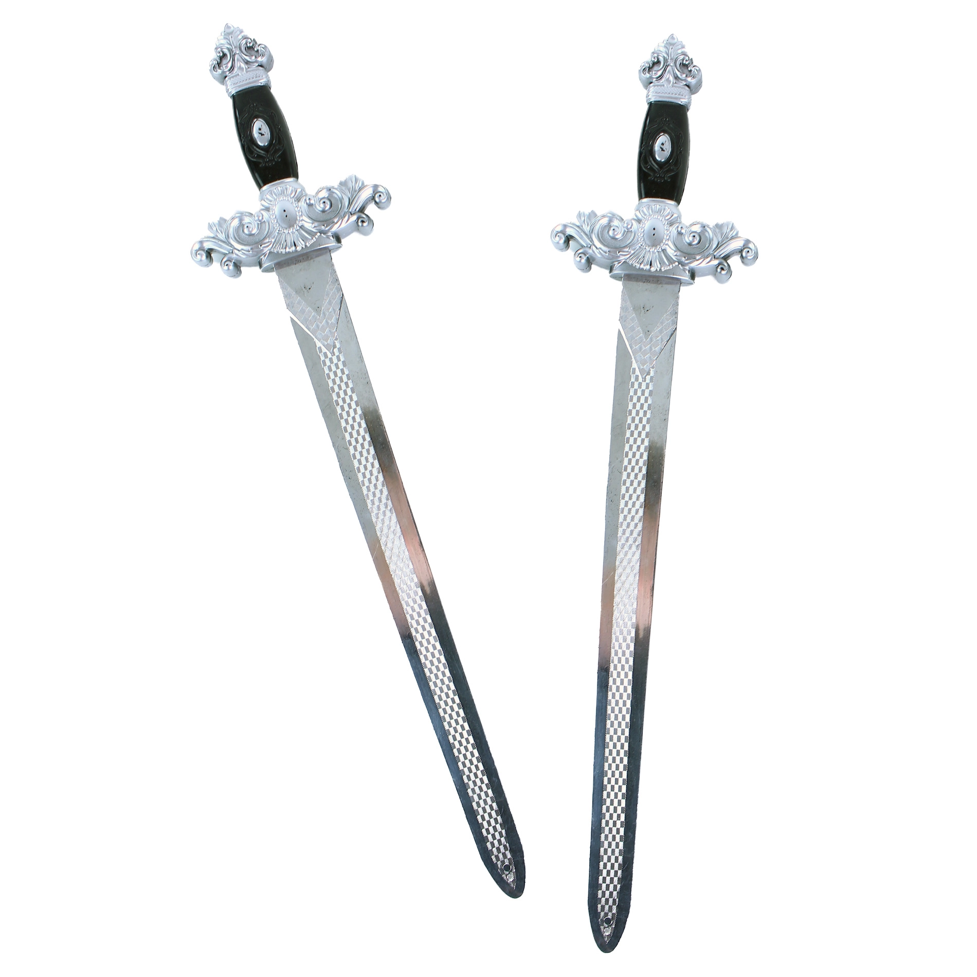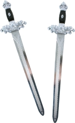 Rinkinį sudaro 2 identiški sidabriniai kardai, 49 cm ilgio, su dekoruotomis rankenomis – idealu dvikovai ar žaidimui poroje.