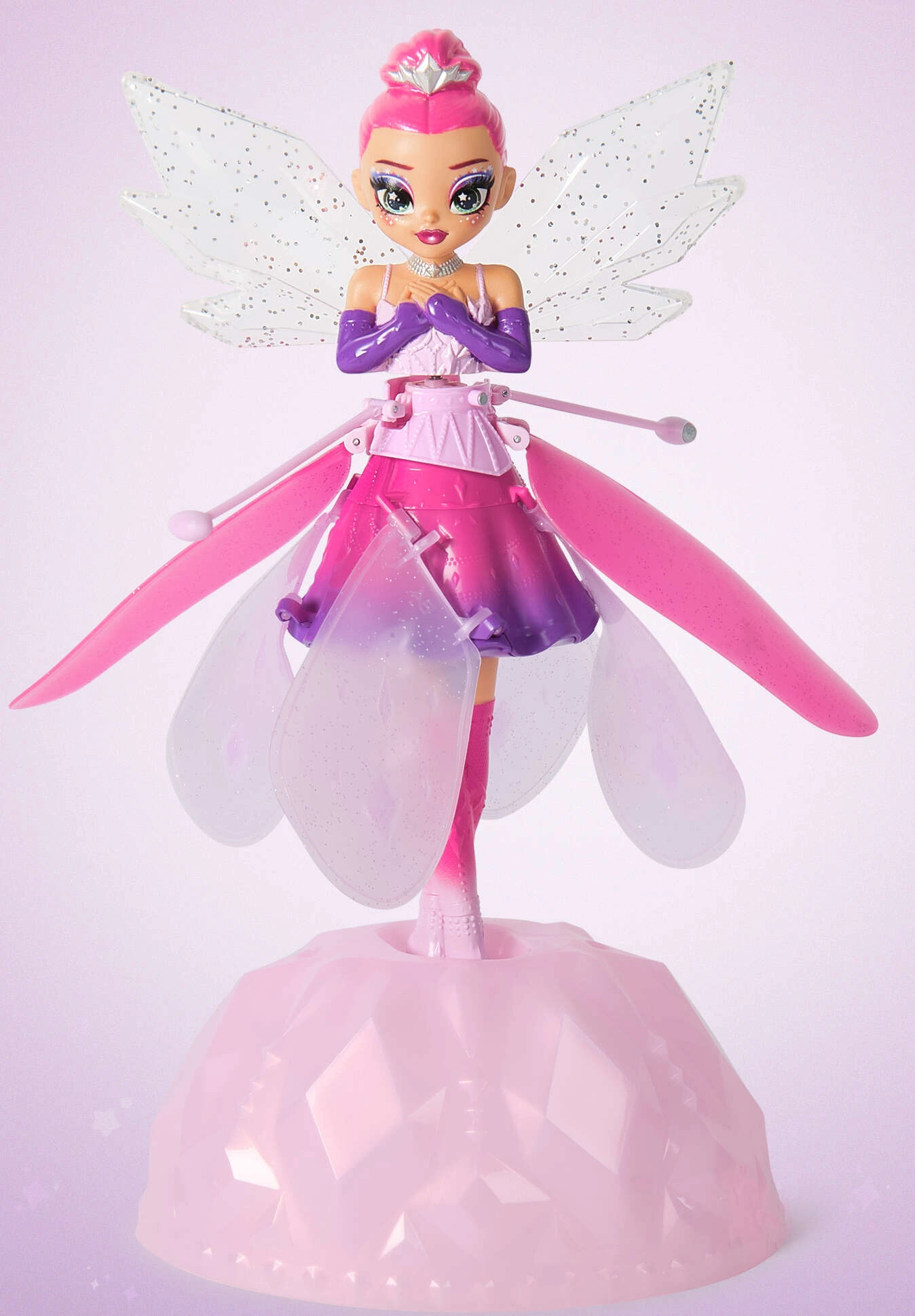 Nuostabus dizainas su krištoliniais sparnais, blizgia suknele ir vaivorykštiniais plaukais daro ją puikia dovana vaikams, mėgstantiems lėles, veiksmo figūrėles ir pasakišką fėjų pasaulį. Dėl USB įkrovimo ji vėl pasiruošusi skrydžiui vos po akimirkos – tereikia pastatyti ant platformos arba švelniai paleisti iš rankos.