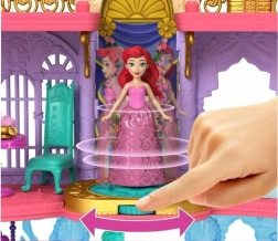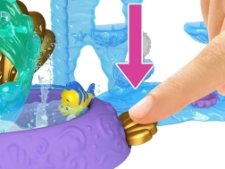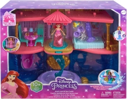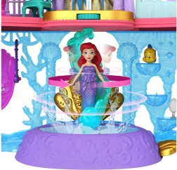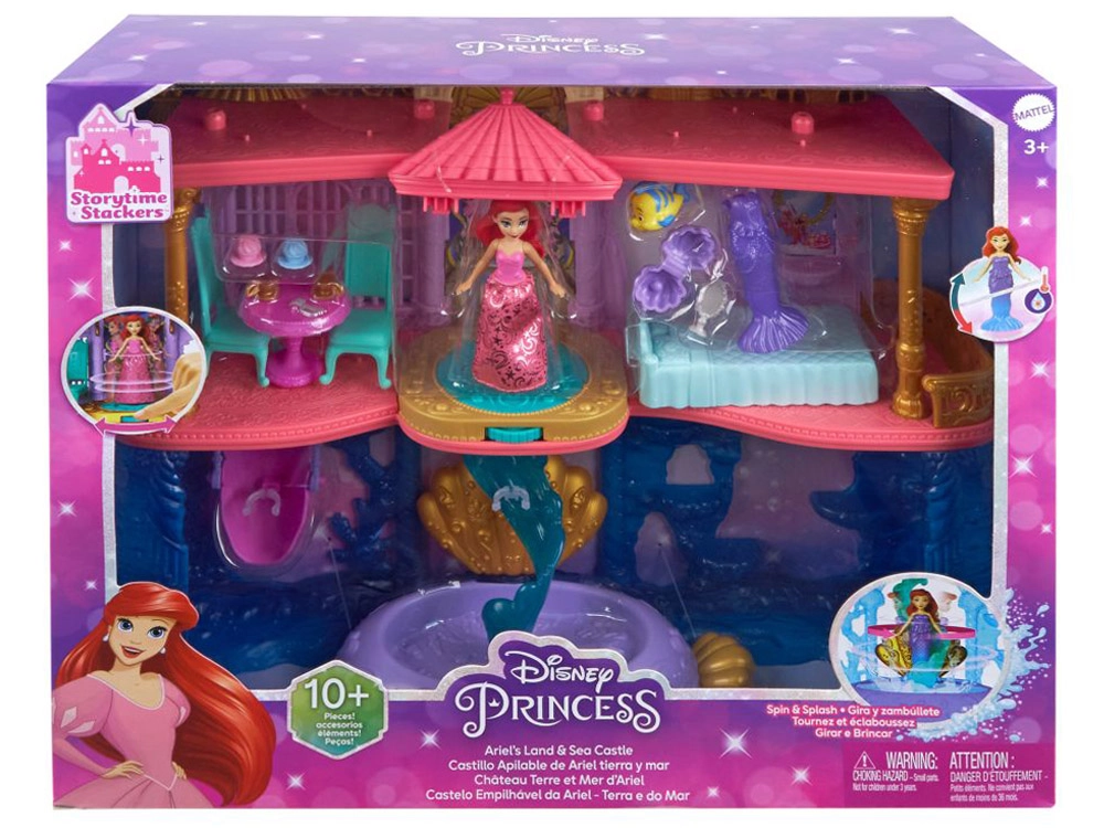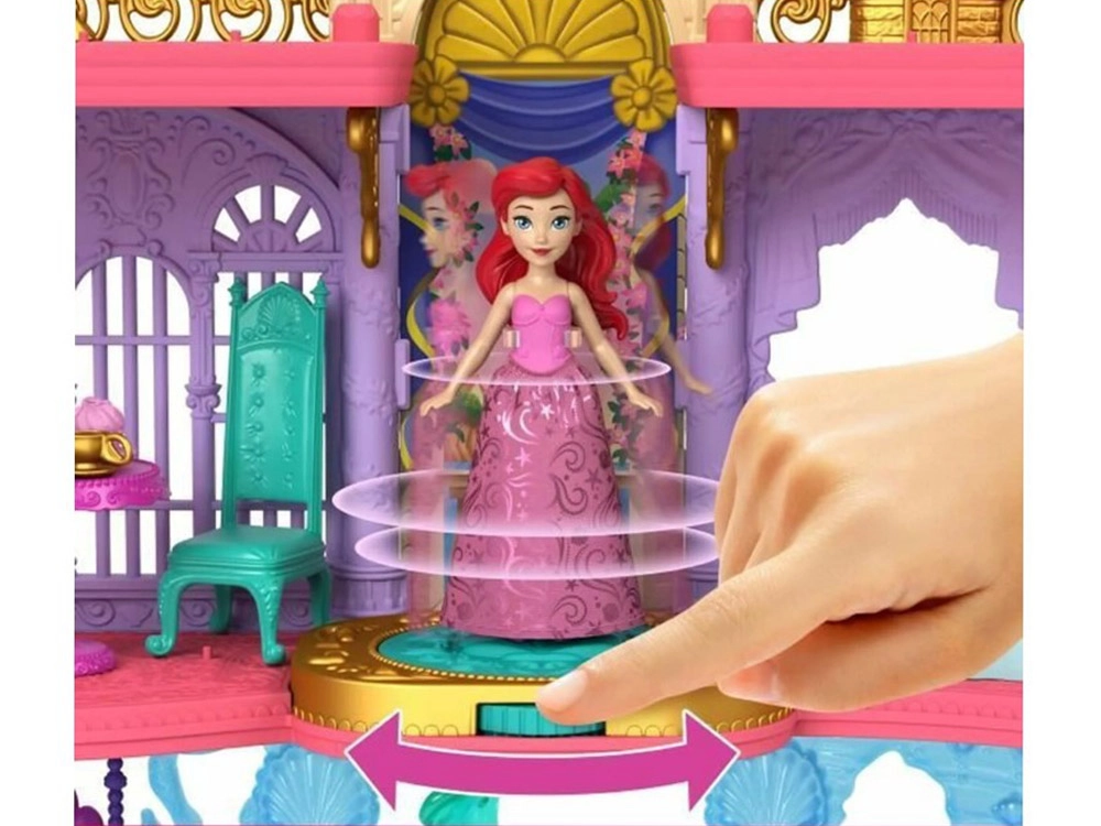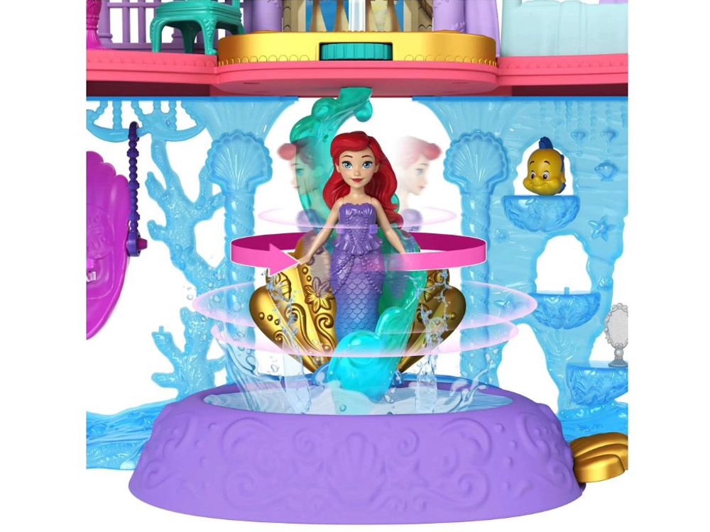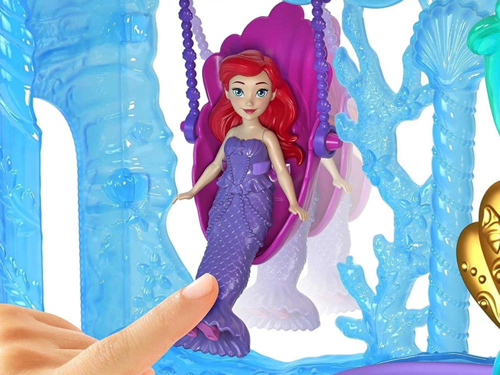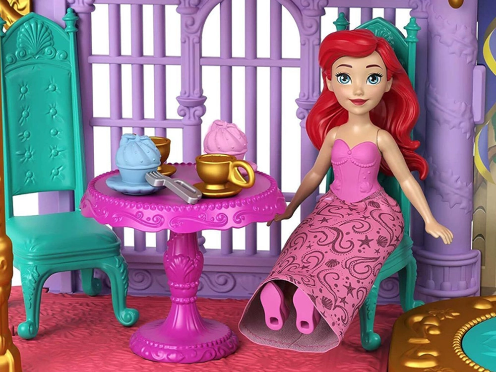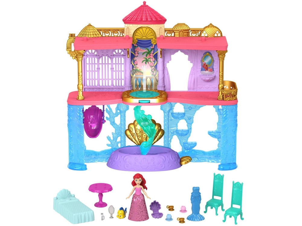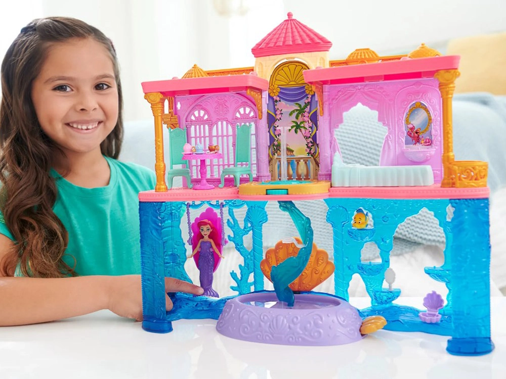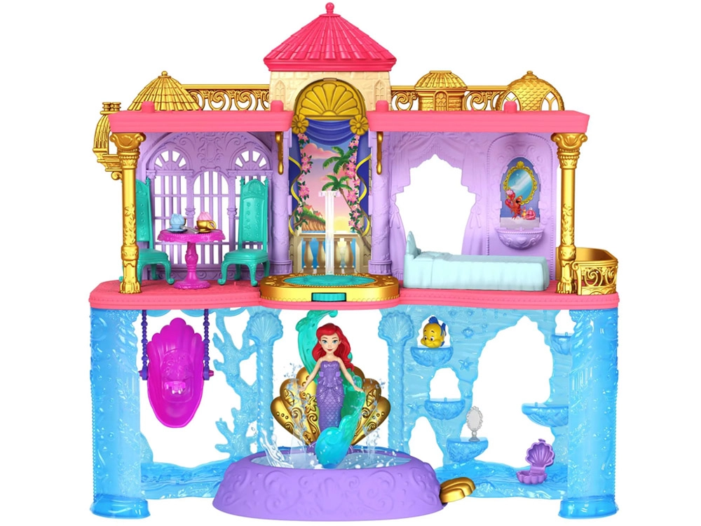 Atraskite užburiantį Disney princesės Ariel pasaulį su dviejų aukštų rūmais, jungiančiais sausumos ir po vandeniu esančias karalystes. Vaikai džiaugsis 6 žaidimų zonomis, besisukančiu parketu, valgomuoju, miegamuoju ir povandeniniu baseinėliu su burbuliukų mygtuku. Rinkinyje yra lėlė Ariel su išvaizdos pakeitimu – rožine suknele ir uodegėle, keičiančia spalvą šiltame vandenyje – begaliniams pasakojimams ir kūrybiškam žaidimui.
