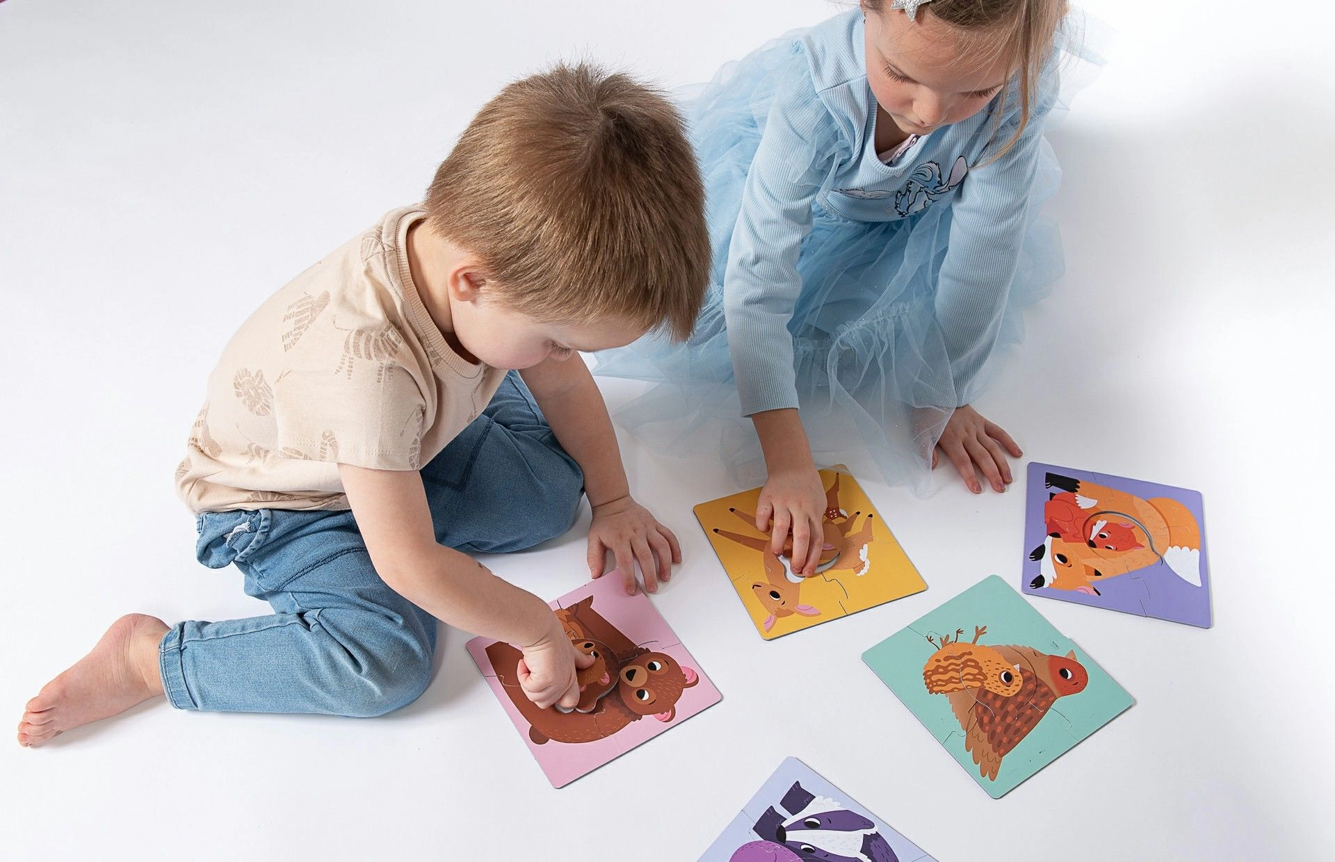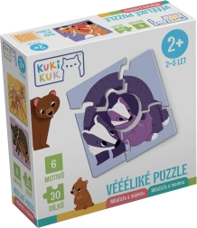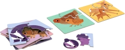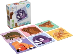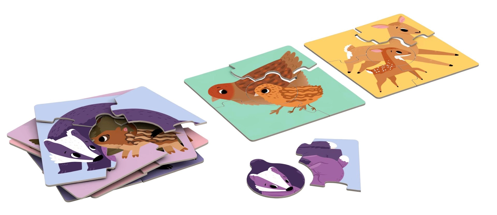 Šiame rinkinyje yra šešios kvadratinės dėlionės su gyvūnų šeimų iliustracijomis – meška, lapė, barsukas, šernas, stirna ir paukštelis. Kiekvieną motyvą sudaro keturios didelės detalės, o galutinis dydis apie 15,5 × 15,5 cm. Vienodos jungčių formos skatina vaikus sistemiškai bandyti ir teisingai priderinti detales, o jauniklių centrinės dalys visuose motyvuose turi vienodą formą.