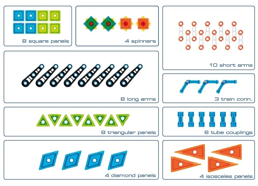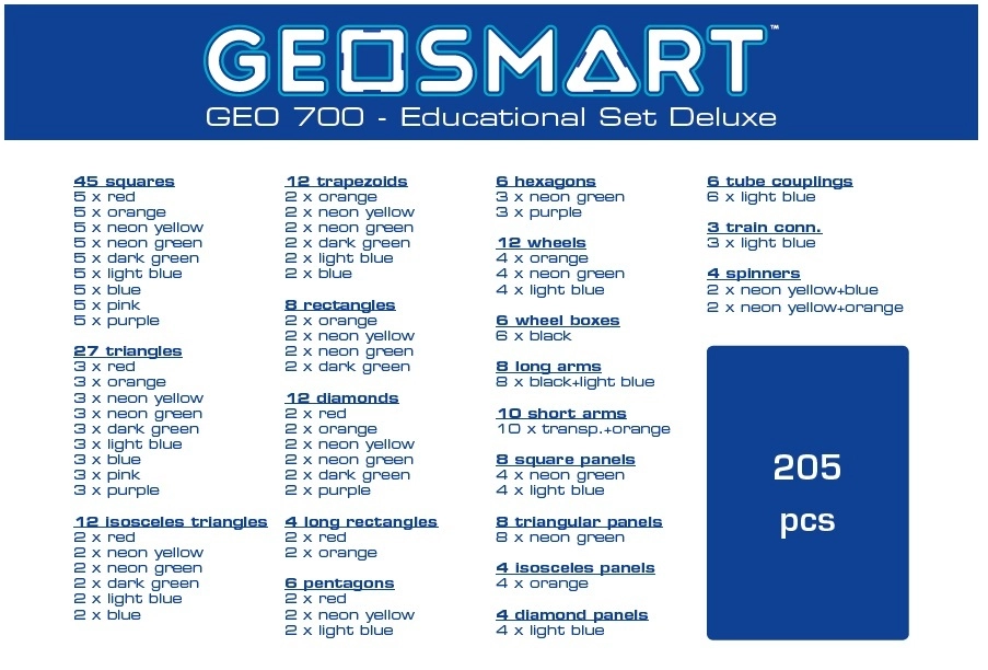 GeoSmart edukacinė konstravimo rinktinė idealiai tinka vaikų kūrybiškumui ir mokymuisi skatinti. Rinkinyje yra: