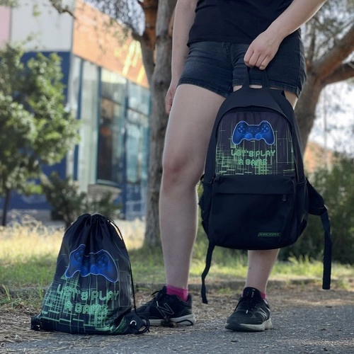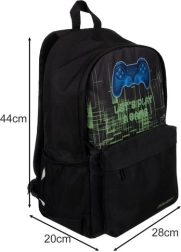 Viduje yra erdvi pagrindinė kamera su paminkštinta nešiojamojo kompiuterio kišene, priekinė kišenė su paslėptu užtrauktuku smulkmenoms ir dvi šoninės tinklinės kišenės buteliui ar skėčiui. Šiuolaikinė žaidimų grafika su valdikliu suteikia kuprinei išskirtinę išvaizdą, kuri patiks visiems žaidimų gerbėjams.