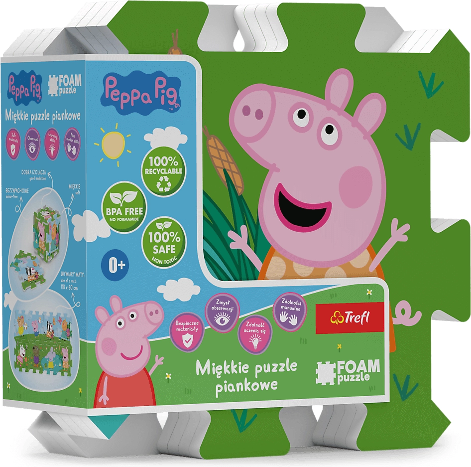 Putų dėlionė su Kiaulytės Pepos motyvu siūlo vaikams saugų ir smagų žaidimų paviršių. Speciali daugiasluoksnė medžiaga primena storą turistinį kilimėlį, yra maloniai minkšta, sugeria smūgius ir saugo nuo grindų šalčio. Dalys lengvai prižiūrimos – po žaidimo pakanka nuvalyti drėgna šluoste.