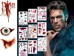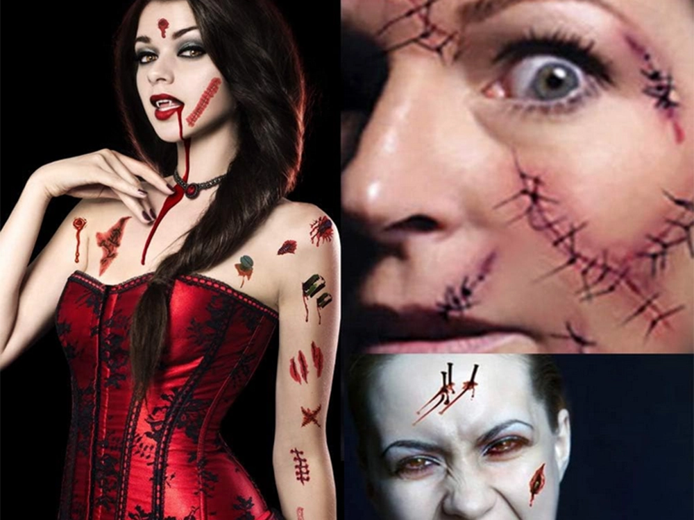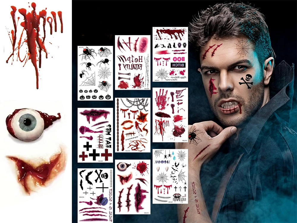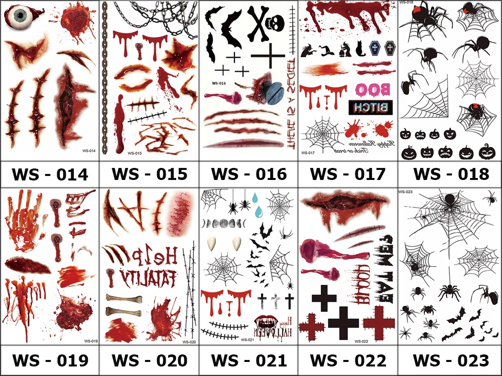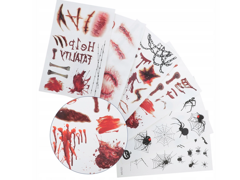 Dėl plataus motyvų pasirinkimo lengvai priderinsite makiažą Helovinui, teminiams vakarėliams ar fotosesijoms. Kiekvienas lapas siūlo šiurpių dizainų miksą – nuo kraujo taškymų ir voratinklių iki gilių randų – maksimaliai realistiškam efektui.