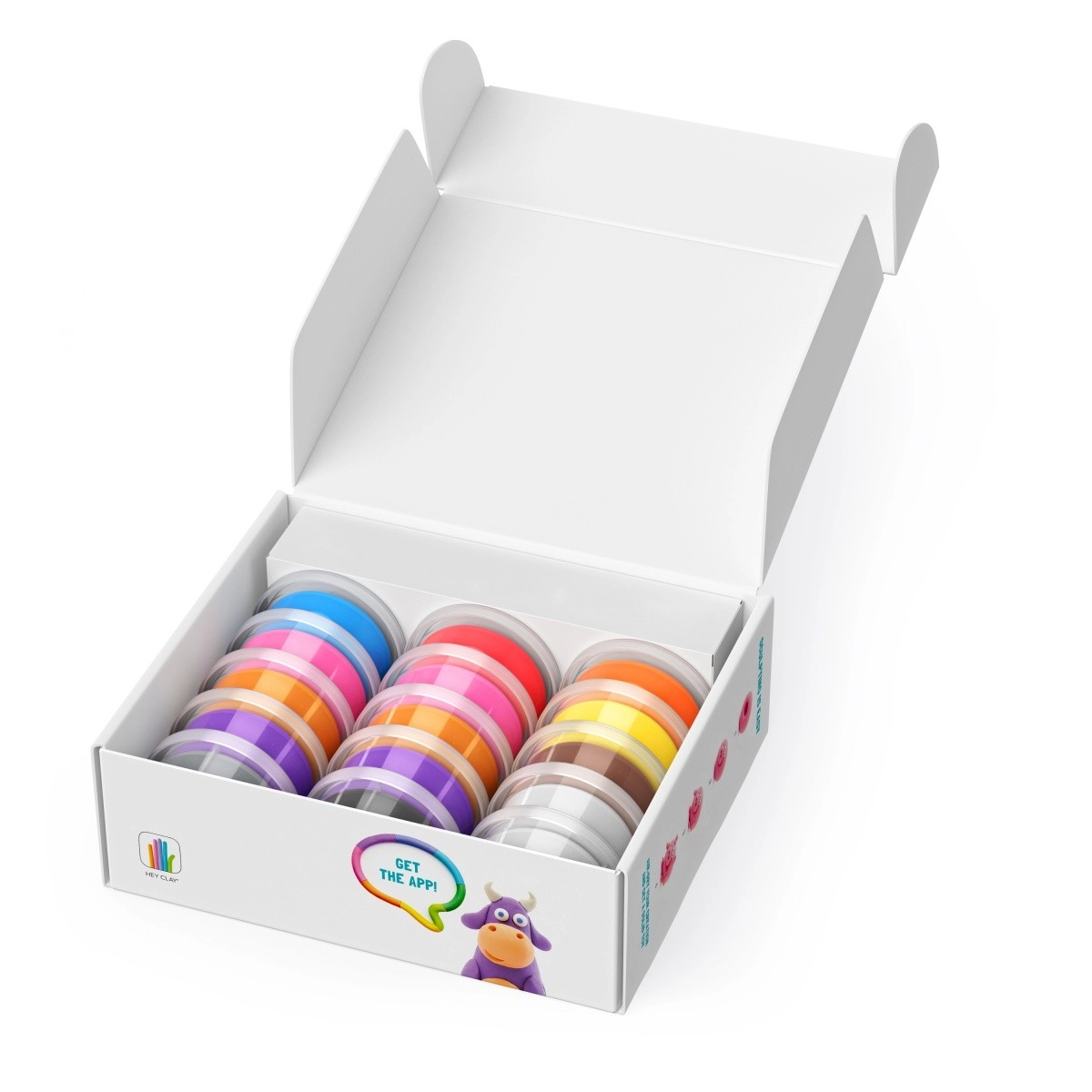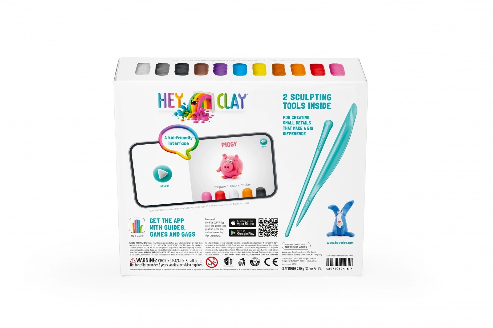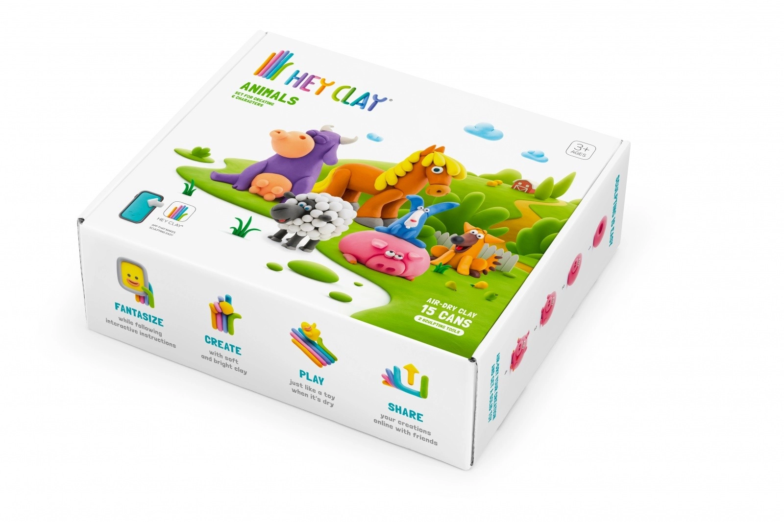 HEY CLAY Gyvūnėliai – kūrybinis rinkinys mažiesiems skulptoriams. Lengvas putų modelinas nelimpa, neteplina ir užbaigus kūrinį sukietėja ore, tad vaikai gali pasilikti savo figūrėles. Dėl platos spalvų paletės ir nuoseklių instrukcijų nemokamoje programėlėje jie lengvai sukurs iki 6 mielų gyvūnėlių.