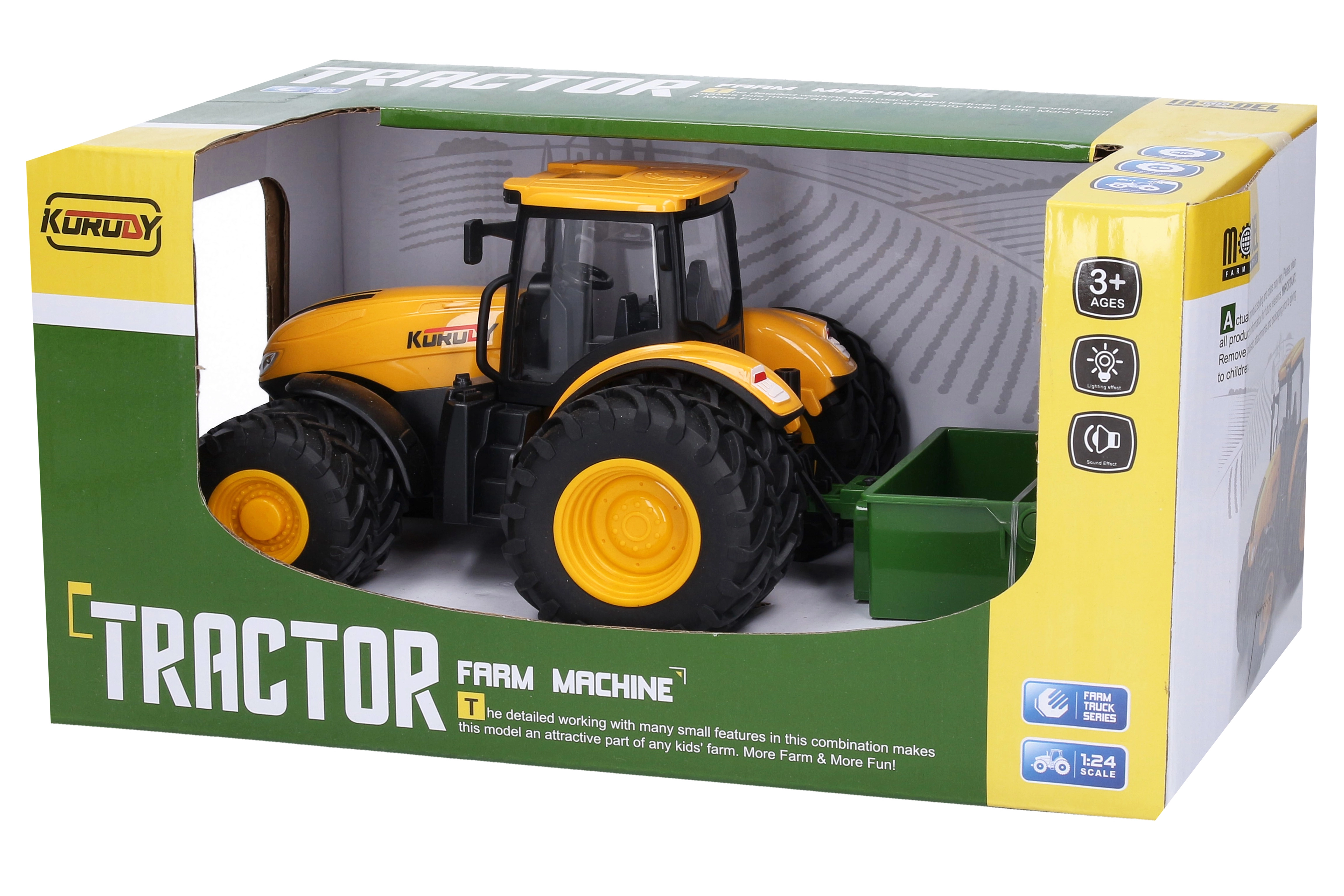 Šis traktorius pateikiamas su priedais, kurie sužadina vaikų smalsumą tyrinėti ir žaisti. Matmenys 27,5x10,5x12 cm – puikus pasirinkimas žaidimams. Traktorius turi dvejus ratus geresniam stabilumui ir reljefo įveikai. Dėl inercinės pavaros traktorius lengvai juda be baterijų. Šviesos ir garso efektai sukuria autentišką ir jaudinantį įspūdį.