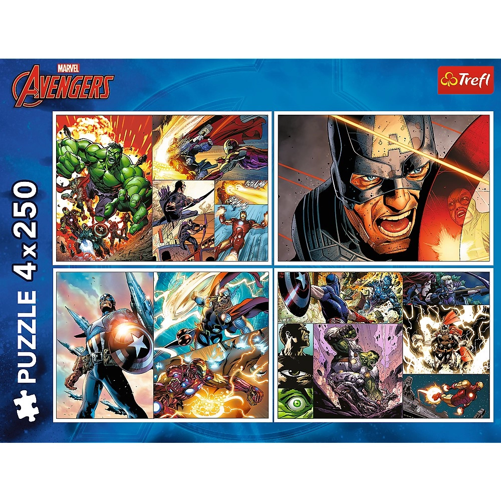 Mėgaukitės valandomis pramogų su 4×250 dalių dėlionių rinkiniu su MARVEL Avengers herojais. Keturi atskiri paveikslėliai, kurių matmenys 340 × 240 mm, lavina vaikų kantrybę, sutelktumą ir vaizduotę, kartu suteikdami puikų užsiėmimą visai šeimai.