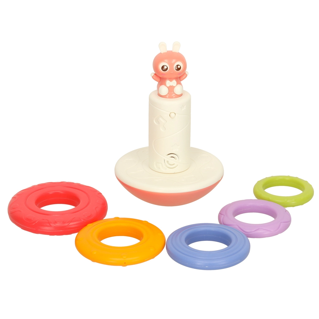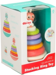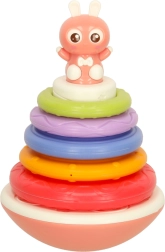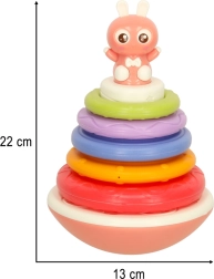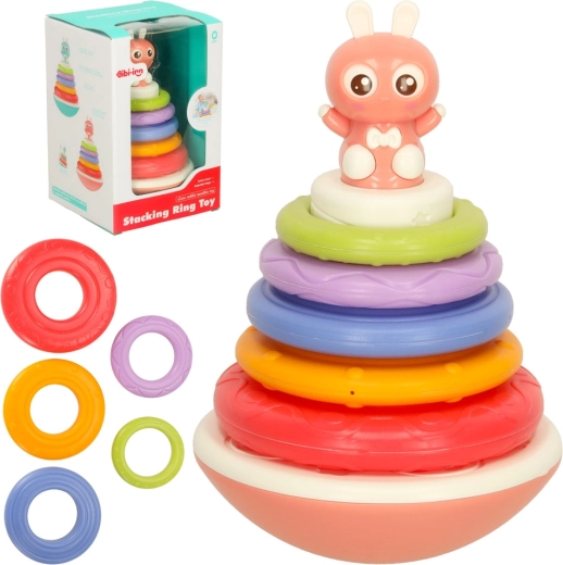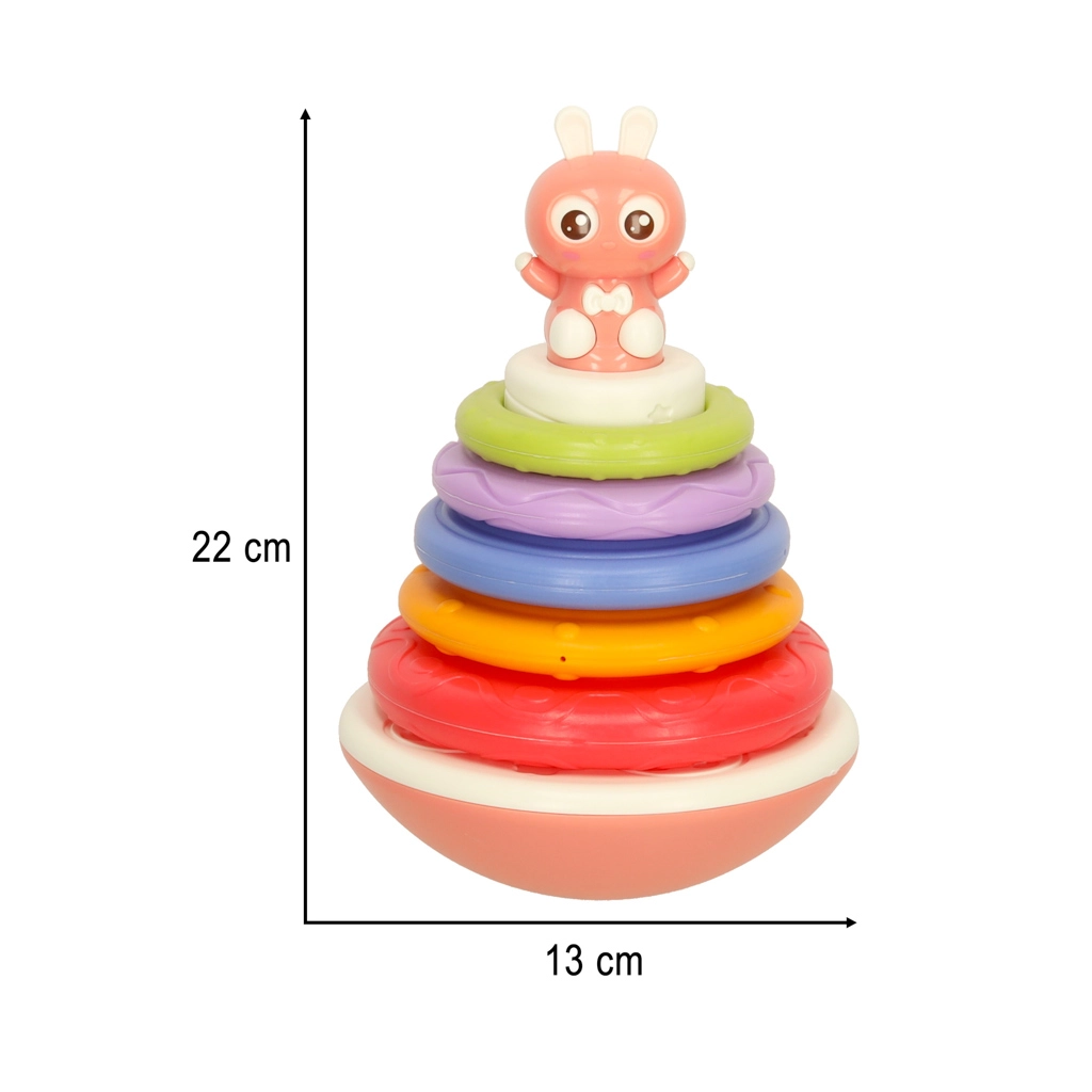 Supamoji žaislas Bibi-Inn sukurtas taip, kad stimuliuotų jūsų vaiko regą, klausą ir motoriką. Smagus triušiukas ant pagrindo viršaus ir ryški žiedų paletė užtikrina valandas pramogų kuriant vaivorykštės bokštą.