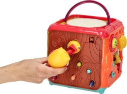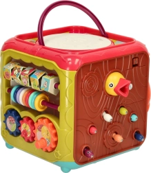 Rinkinyje taip pat yra mėgstamas žaidimas „pamaitink paukščiuką“ su magnetiniais vabalėliais ir besisupančia pelėdžiuke, taip pat spalvotos kaladėlės formų rūšiuokliui. Dėka patogios rankenėlės kubą lengva nešiotis – puikiai tinka žaisti namuose ir kelionėse.
