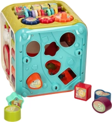 Formų rūšiuoklis, suktukai ir stumdomi elementai lavina suėmimą, koordinaciją ir užduočių sprendimą. Spalvotos kaladėlės ir skaičiai padeda atpažinti spalvas, formas ir skaičiuoti.