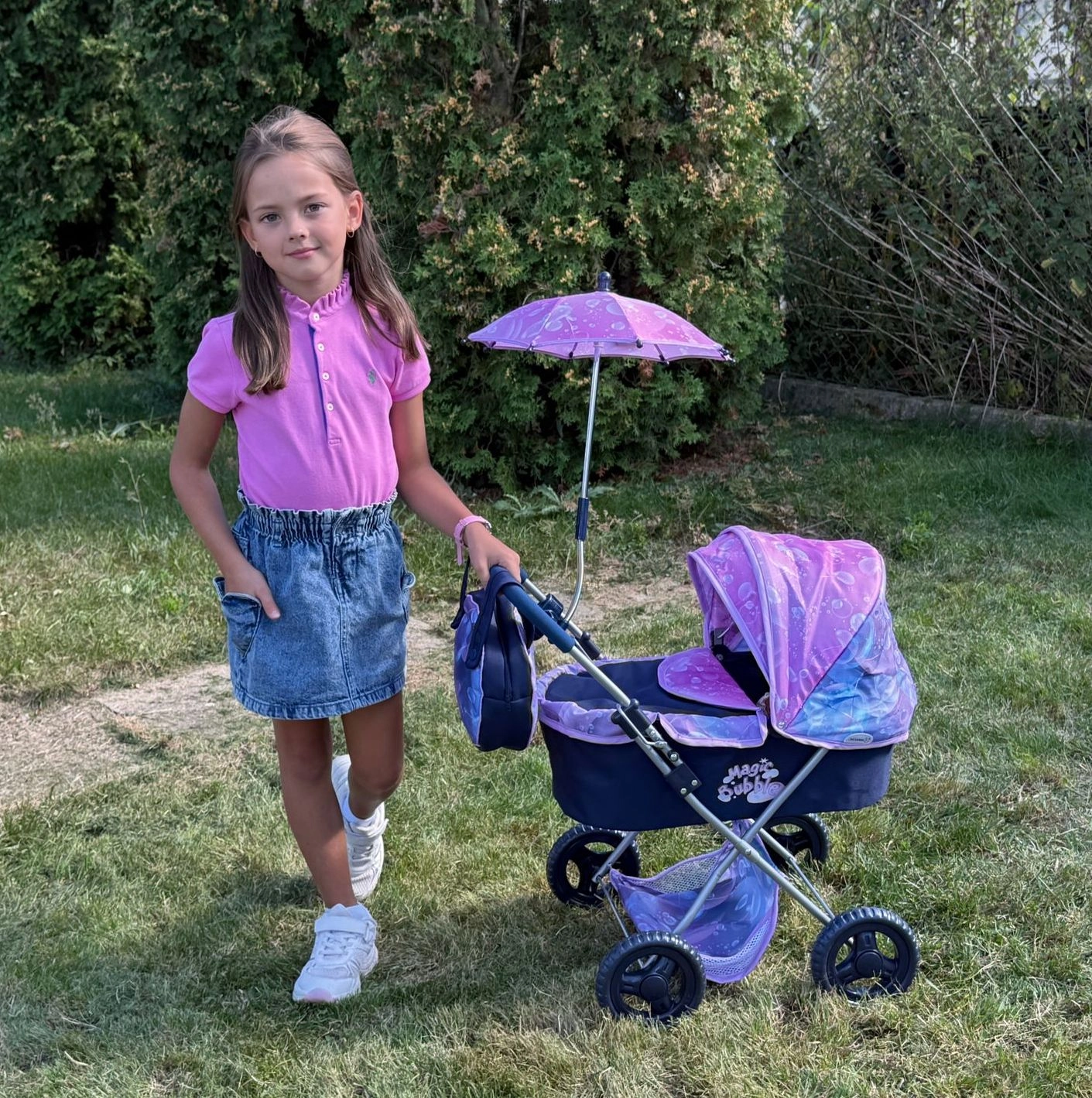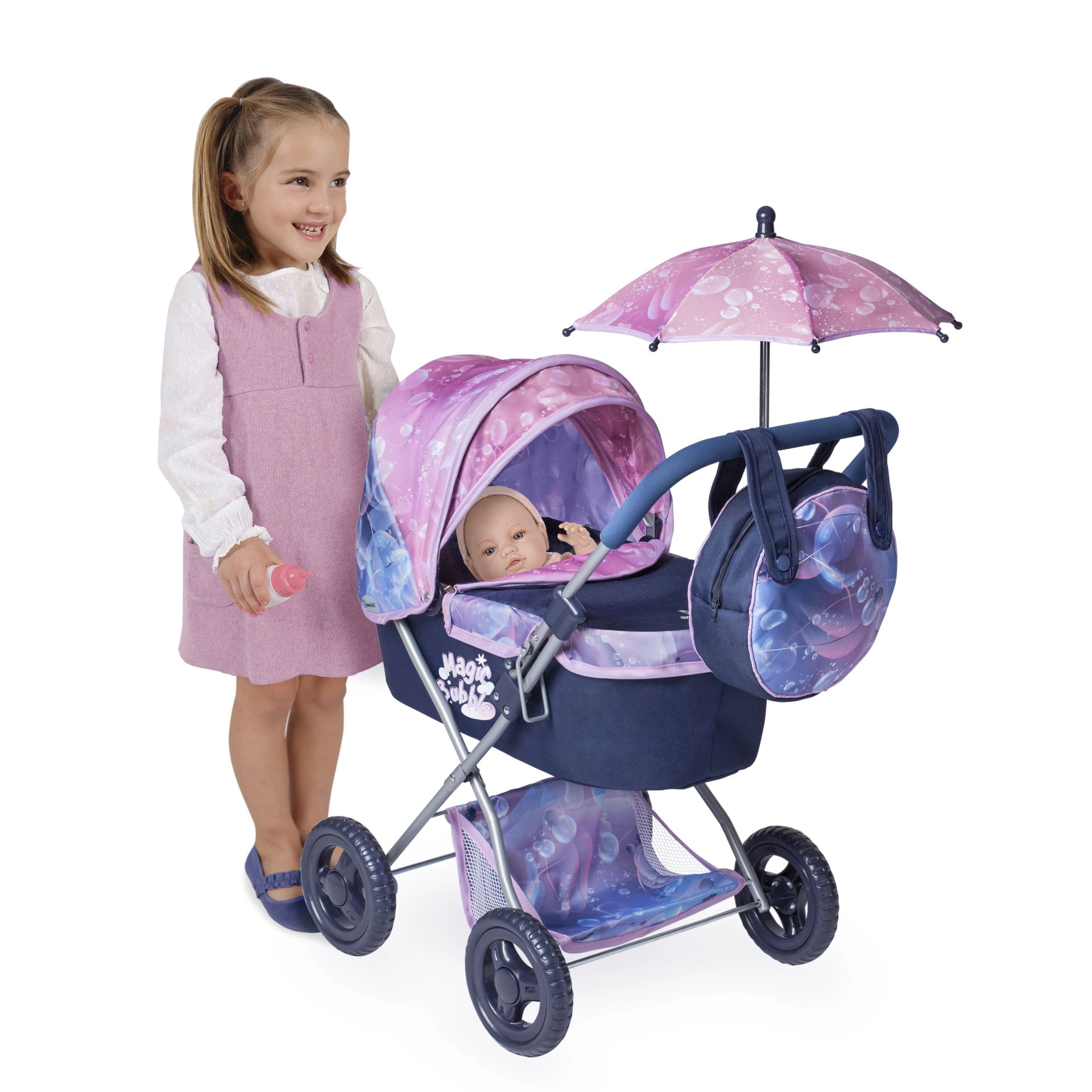 Stilingas lėlių vežimėlis iš kolekcijos Magic Bubble išsiskiria švelniu vaivorykštiniu dizainu, sulankstoma konstrukcija ir gausia komplektacija. Rinkinyje yra skėtis nuo saulės, apvalus krepšys, čiužinukas ir apatinis krepšelis. Dėl žemos rankenos ir lengvo svorio puikiai tinka mažesnėms mergaitėms nuo 3 metų.