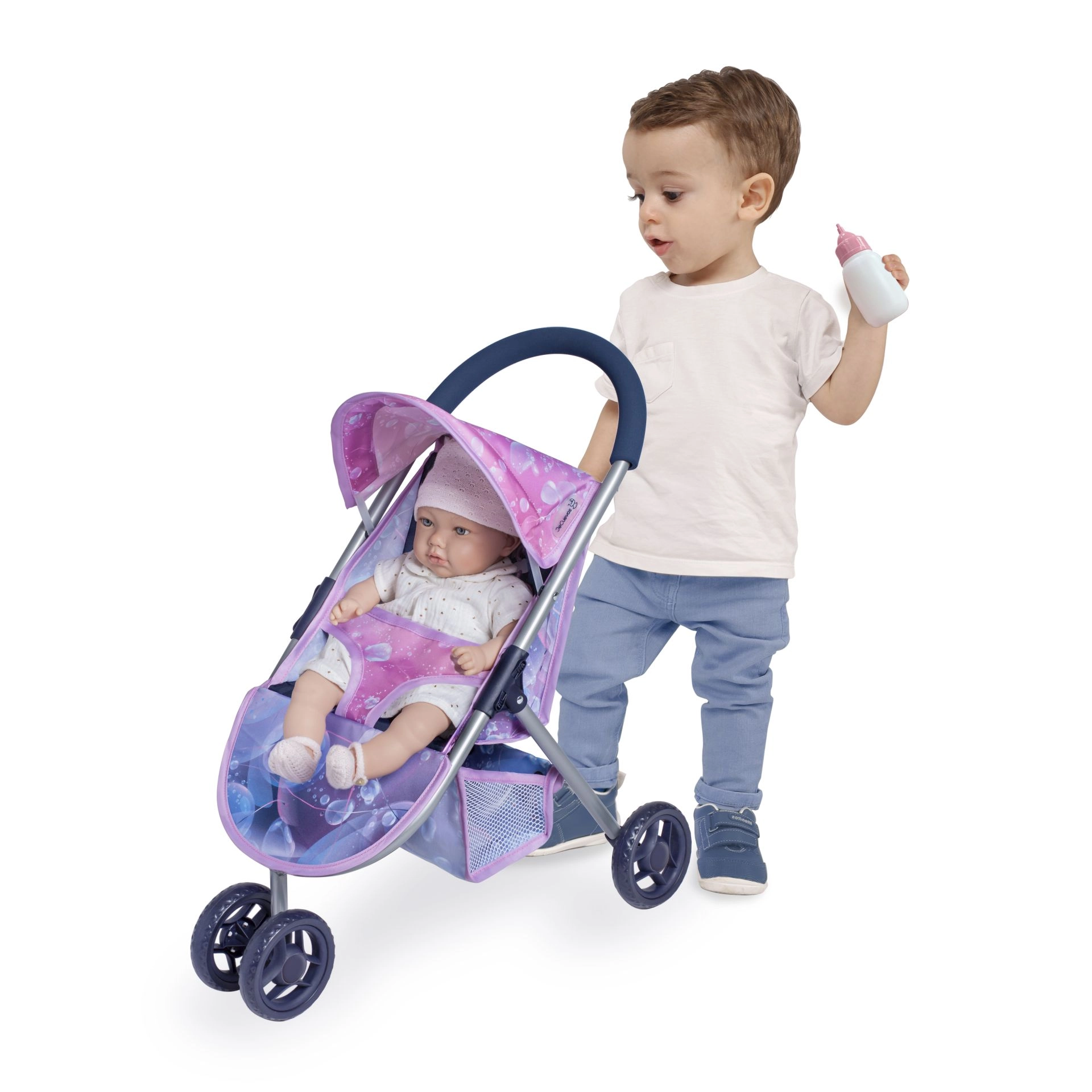 Atraskite ispanišką dizainą vaikišku dydžiu. Šis triratis lėlių vežimėlis iš MAGIC BUBBLE kolekcijos pasižymi sklandžiais spalvų perėjimais nuo rožinės iki karališkos mėlynos ir ikoniniais burbuliukais, kurie pradžiugins kiekvieną mažąją globėją. Dėl žemos rankenos ir 1,5 kg svorio vežimėlį patogu vairuoti net mažesniems vaikams.