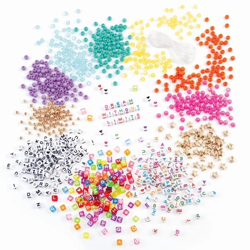 Rinkinyje yra raidės, apvalūs karoliukai ir žvaigždučių formos – viskas ryškiomis spalvomis, kad galėtumėte kurti asmeninius papuošalus.