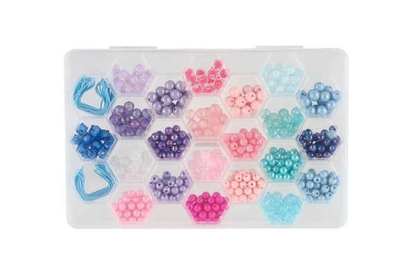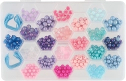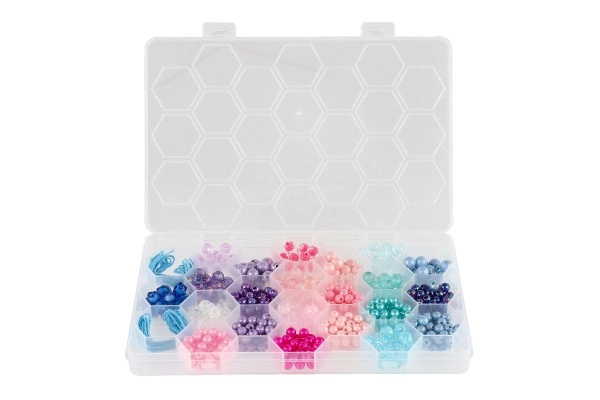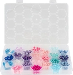 Plastikinė dėžutė su šešiakampio dizaino dangteliu palengvina karoliukų laikymą ir rūšiavimą pagal spalvas.