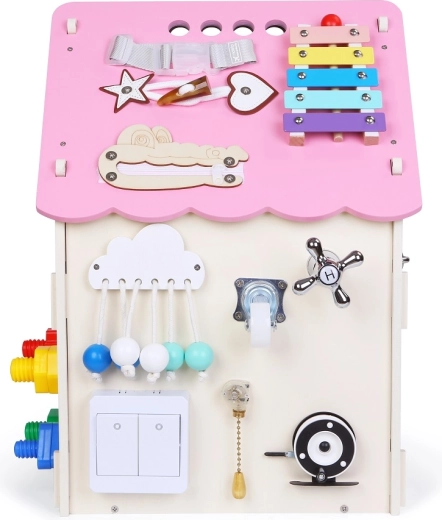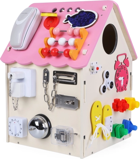 Atraskite gausiai aprūpintą veiklų namelį (activity board), kuris sujungia žaidimą ir mokymąsi viename. Dėl įvairių mechaninių elementų – spynelių, sagtelių, raištelių, ratukų ir jungiklių – vaikai tobulina smulkiąją motoriką ir loginį mąstymą, kartu lavina kūrybiškumą ir smalsumą.