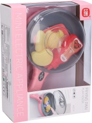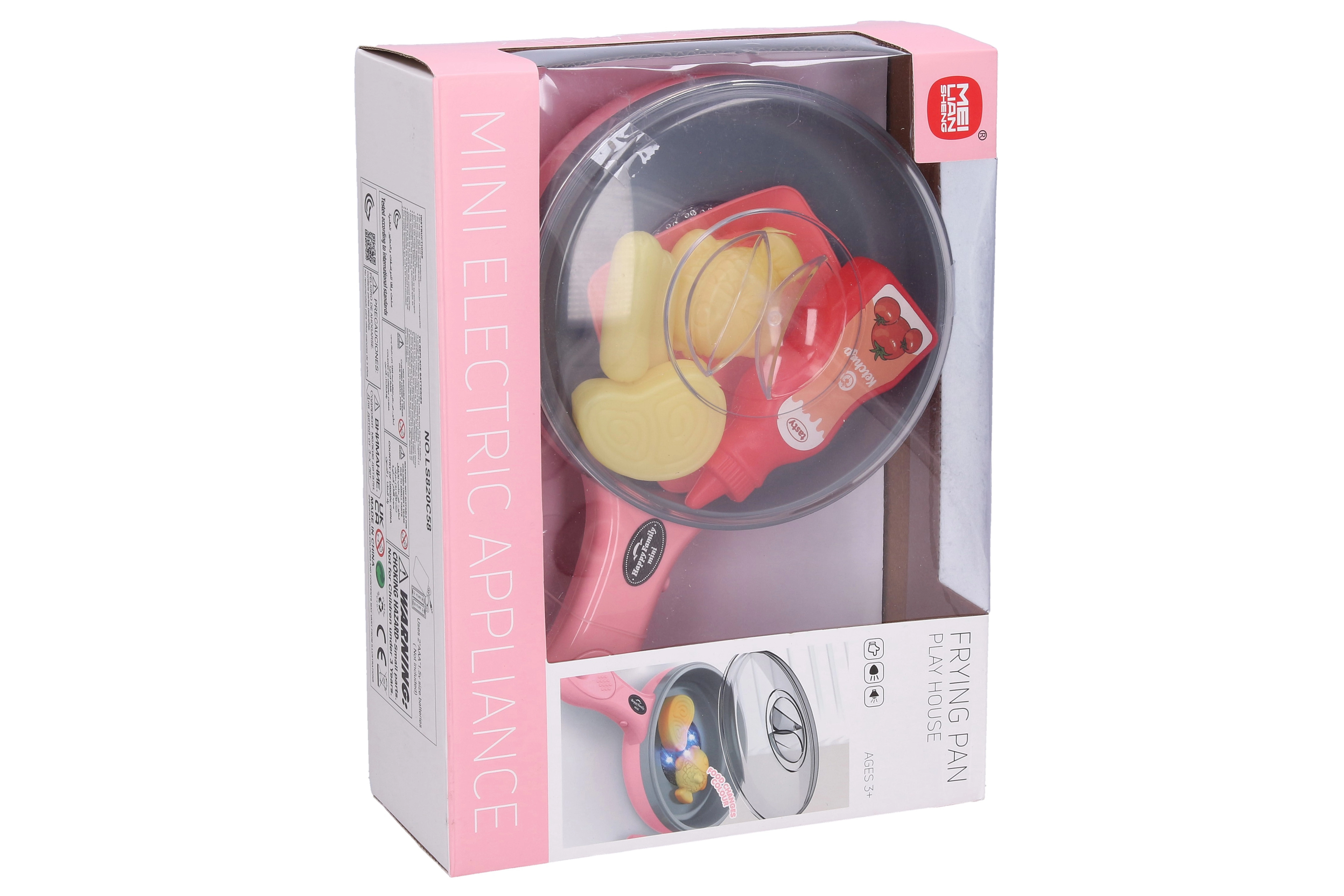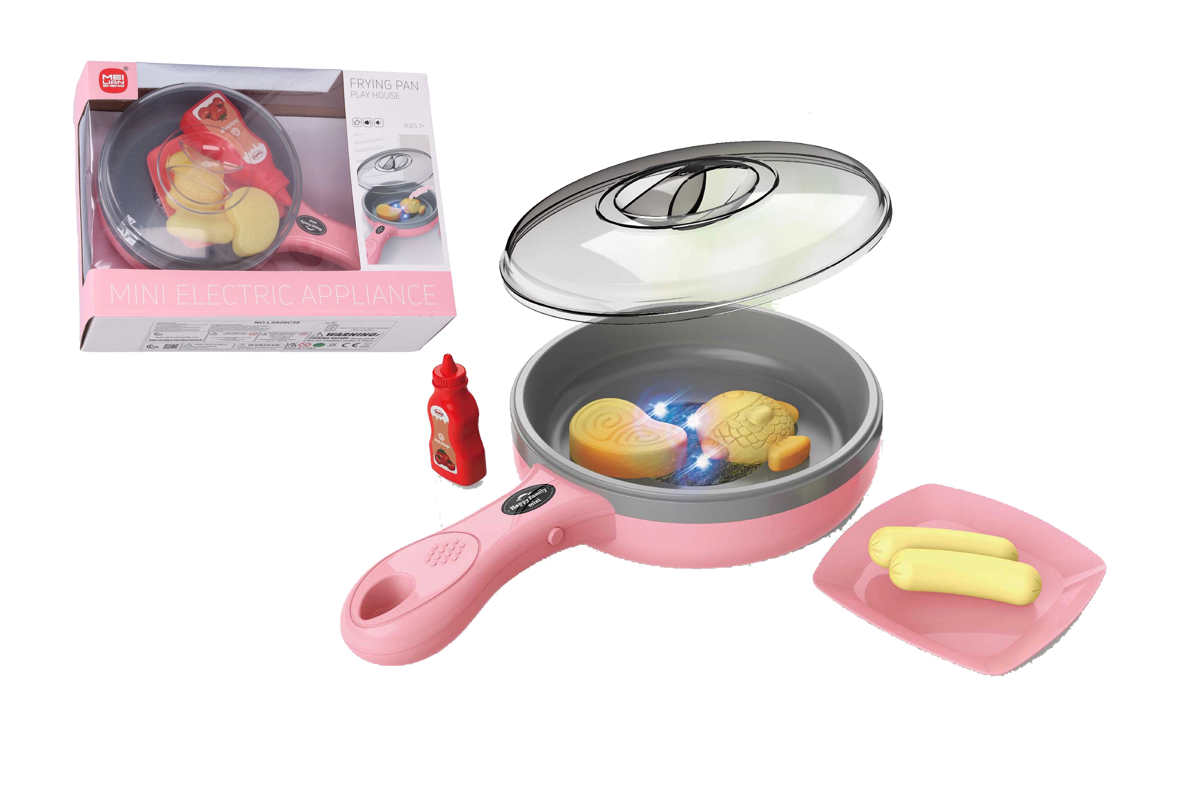 Linksmas žaislas vaikų virtuvei – elektroninė rožinė keptuvė, kurios skersmuo apie 27 cm, „kepant“ keičia maisto spalvą ir turi šviesos bei garso efektus. Rinkinyje yra keptuvė su dangčiu, lėkštutė, kečupas ir 4 maisto gabalėliai. Veikia su 2× AAA baterijomis (nepridedamos).