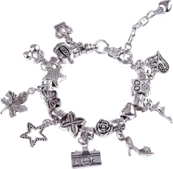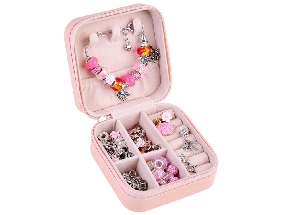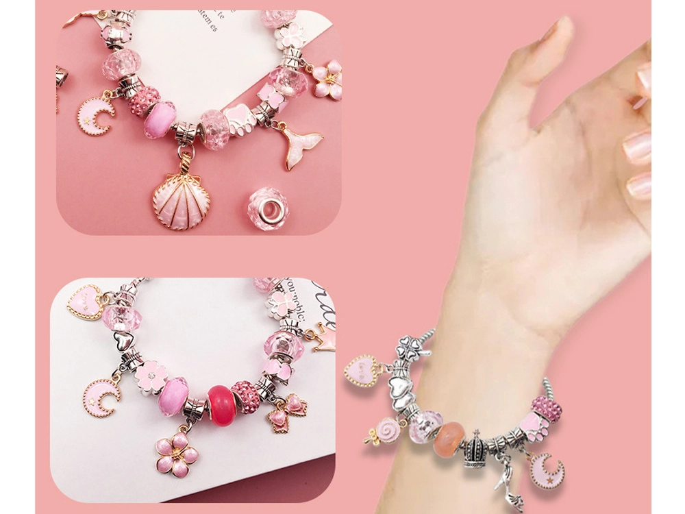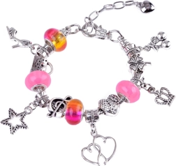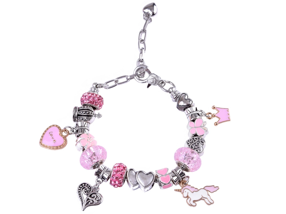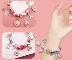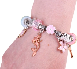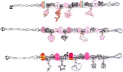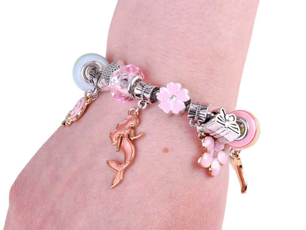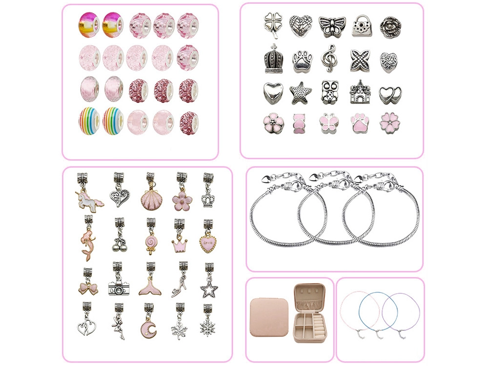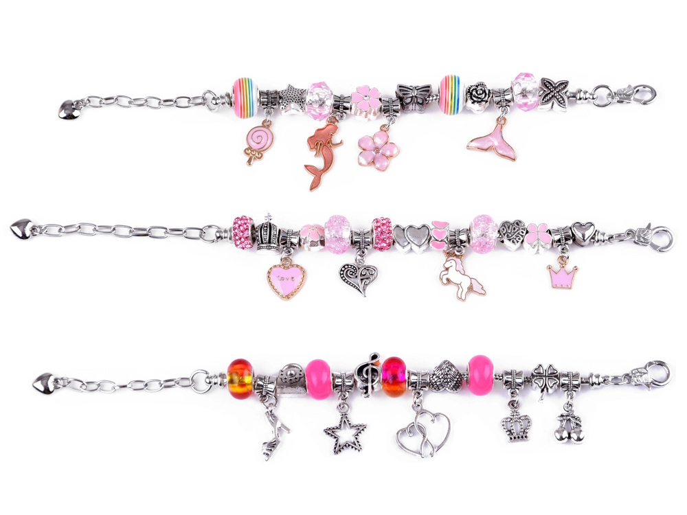 Rinkinyje yra viskas, ko reikia gražiems apyrankėms ir vėriniams kurti: įvairūs karoliukai, pakabukai ir virvelės.