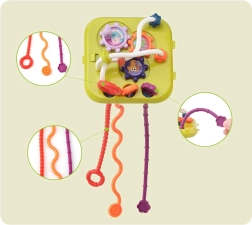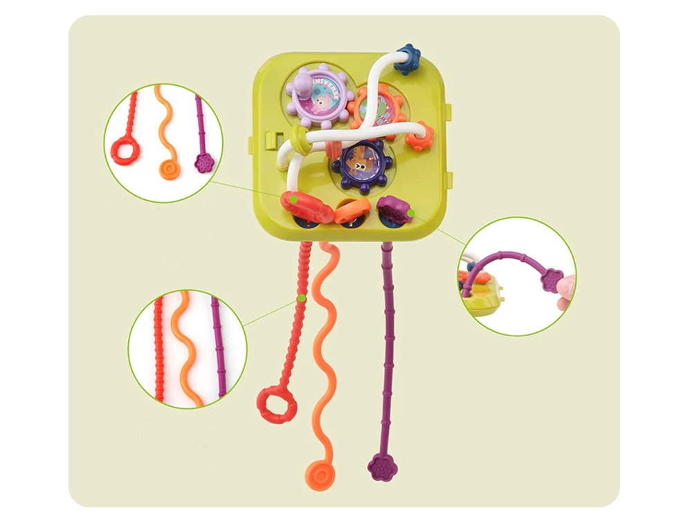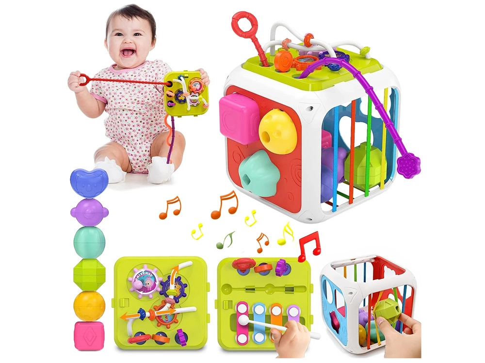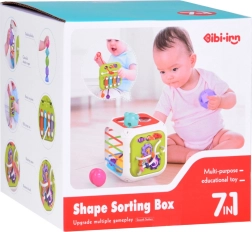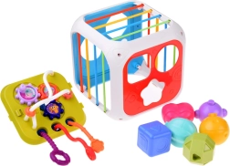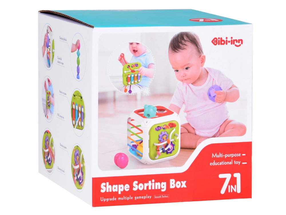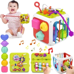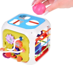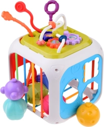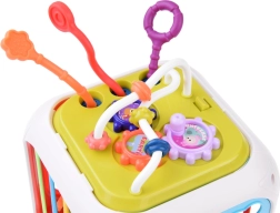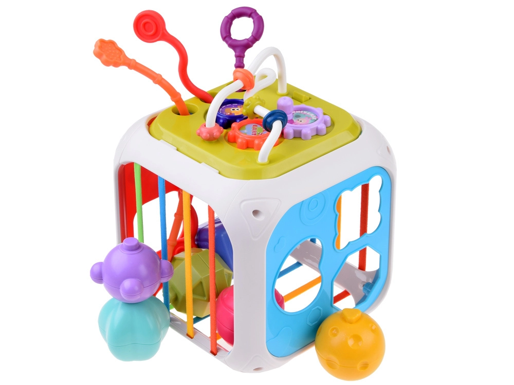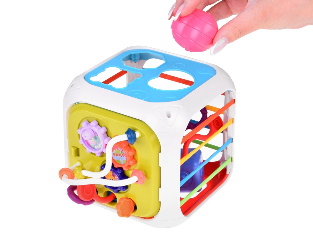 Šis spalvingas edukacinis kubas iš kokybiško plastiko apjungia mėgstamas mažų vaikų veiklas viename kompaktiškame objekte. Dvi sienelės veikia kaip formų rūšiavimo dėžutė su įvairiomis angomis, dar trys turi elastingas gumeles kaladėlėms stumti ir lytėjimui treniruoti. Dvipusė panelė papildo cimbolais ir traukimo virvelėmis su skirtingomis tekstūromis vienoje pusėje bei krumpliaračiais ir slenkamais karoliukais kitoje.