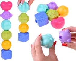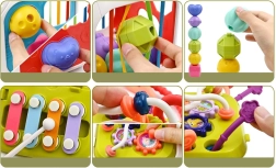 Dvi sienelės su įvairių formų angomis ir 6 spalvotos kaladėlės/barškučiai moko vaikus atpažinti formas, lavina akies–rankenos koordinaciją ir skatina loginį mąstymą.