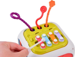 Žaidimas su kubu natūraliai lavina smulkiąją motoriką, moko vaikus atpažinti spalvas ir formas ir skatina loginį mąstymą. Dėka barškančių kaladėlių ir įvairių tekstūrų suteikia gausią jutiminę stimuliaciją ir ilgas susikaupusio žaidimo minutes.