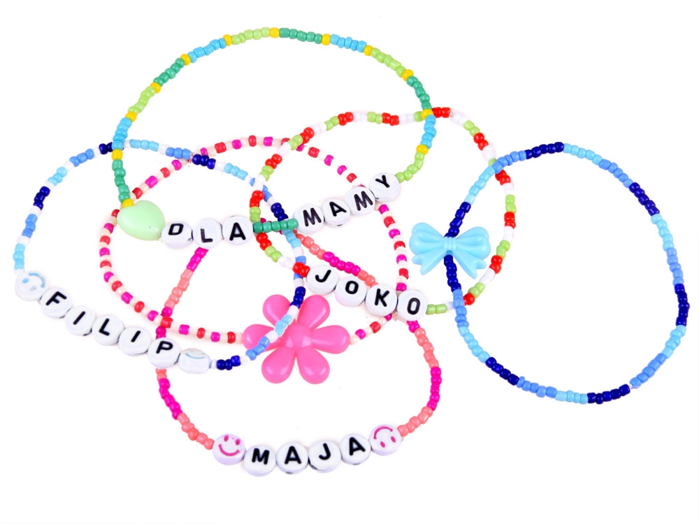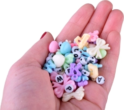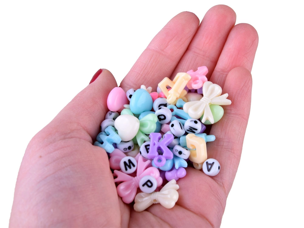 - Platus formų ir spalvų pasirinkimas – raidės, širdelės, gėlytės, kaspinėliai ir margaspalviai karoliukai.