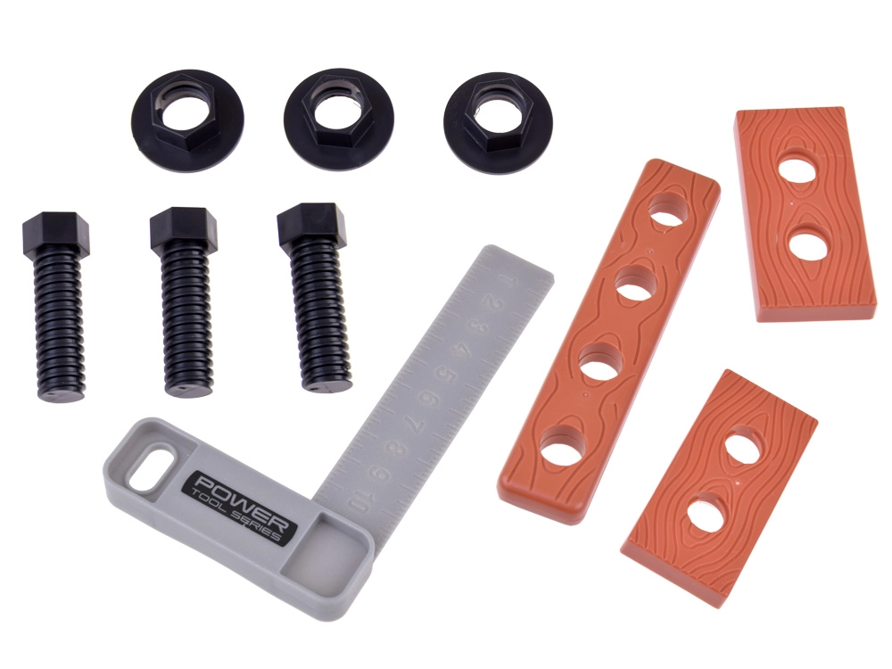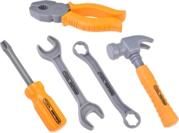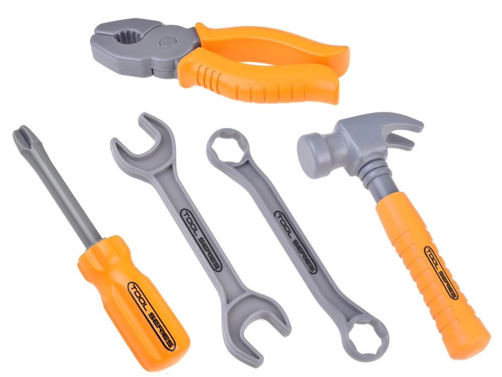 Rinkinyje yra plaktukas, raktai, atsuktuvas, varžtai, veržlės ir konstravimo detalės – idealiai tinka smulkiajai motorikai lavinti ir kūrybiškam statymui.