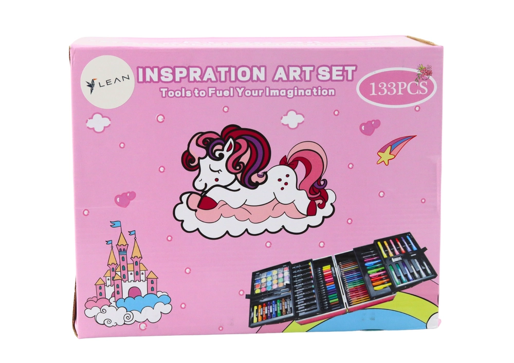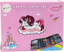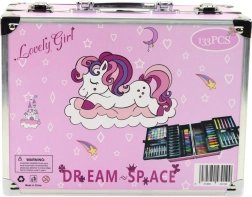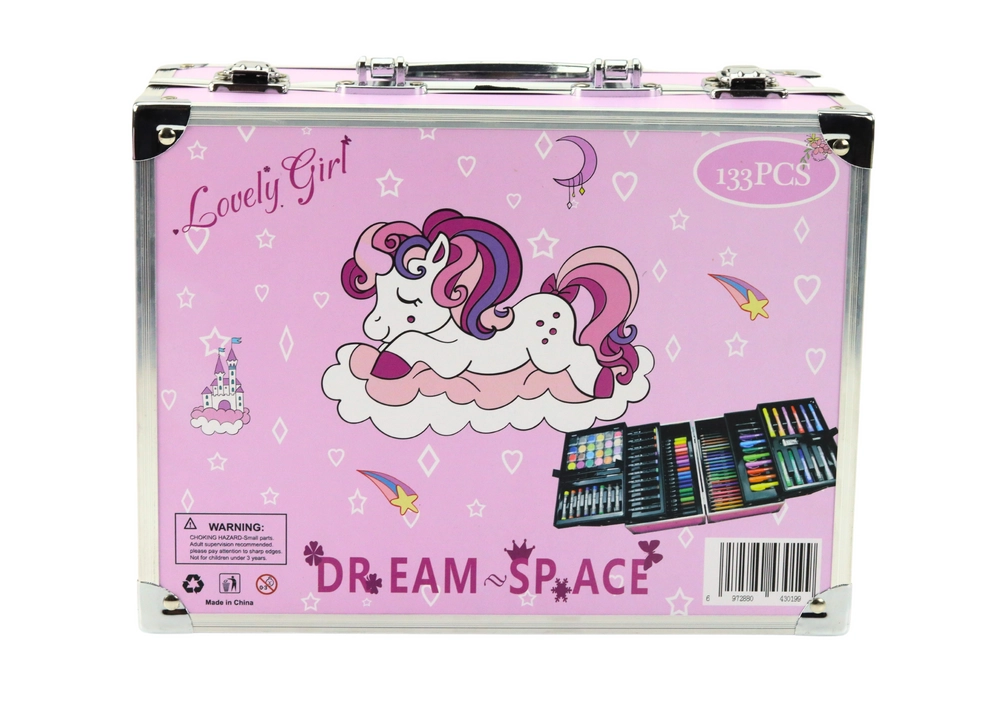 Šis gausiai aprūpintas kūrybinis rinkinys elegantiškame lagaminėlyje su vienaragiu yra puiki dovana mažiesiems menininkams. Dėl plataus priemonių pasirinkimo galima išbandyti įvairias technikas – nuo subtilaus eskizavimo ir spalvinimo iki ryškių tapybos potėpių. Išlankstoma konstrukcija padeda išlaikyti tvarką ir aiškiai matyti visus įrankius.