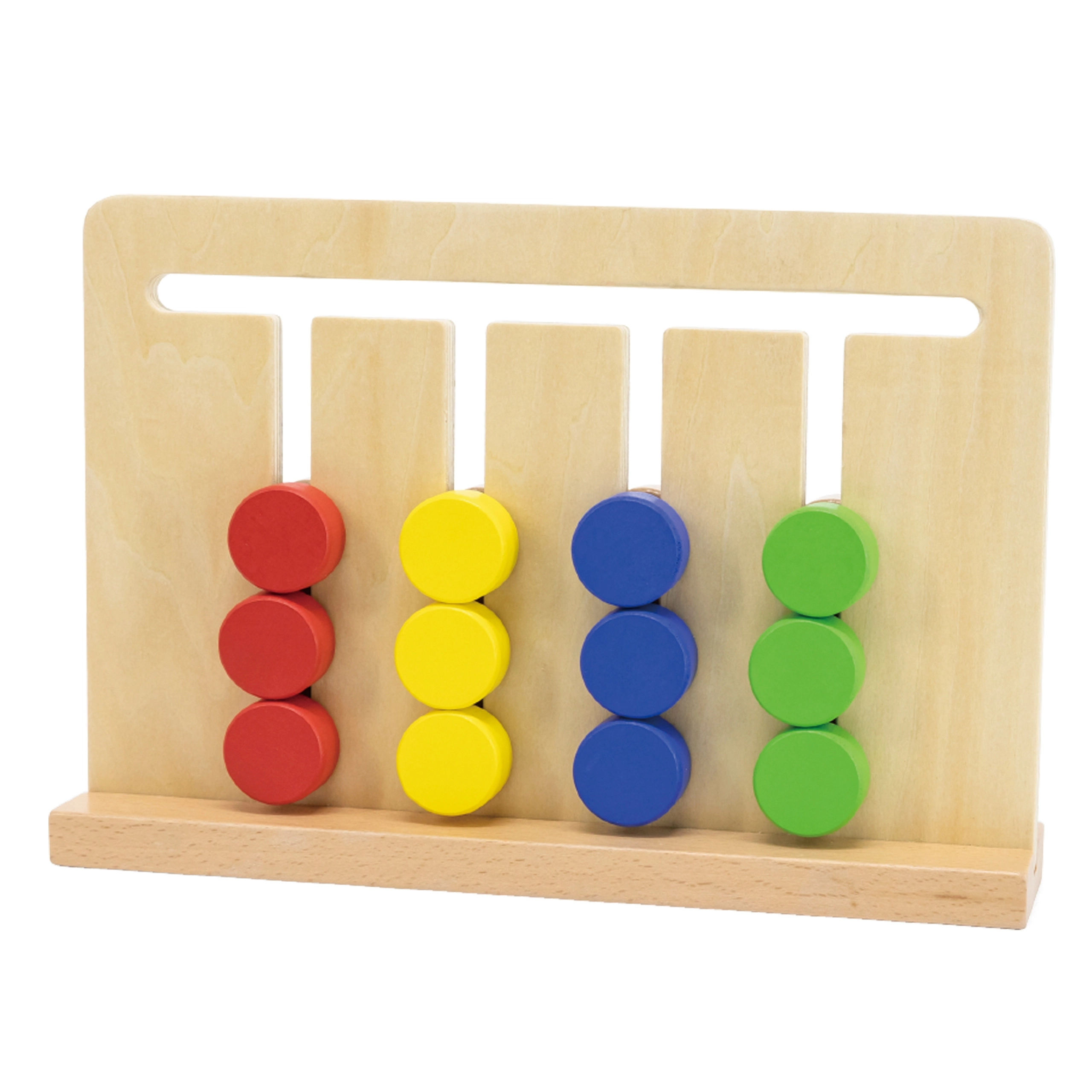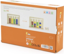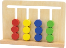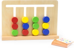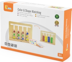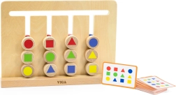 Medinis loginis žaidimas iš VIGA moko 3+ metų vaikus atpažinti spalvas ir formas, planuoti veiksmus ir susikaupti. Ant 4 takelių vaikai stumdo 12 dvišalių kaladėlių pagal 16 dvišalių kortelių. Du sudėtingumo lygiai (spalvos → formos) užtikrina ilgą ir prasmingą pramogą pagal Montessori principus.
