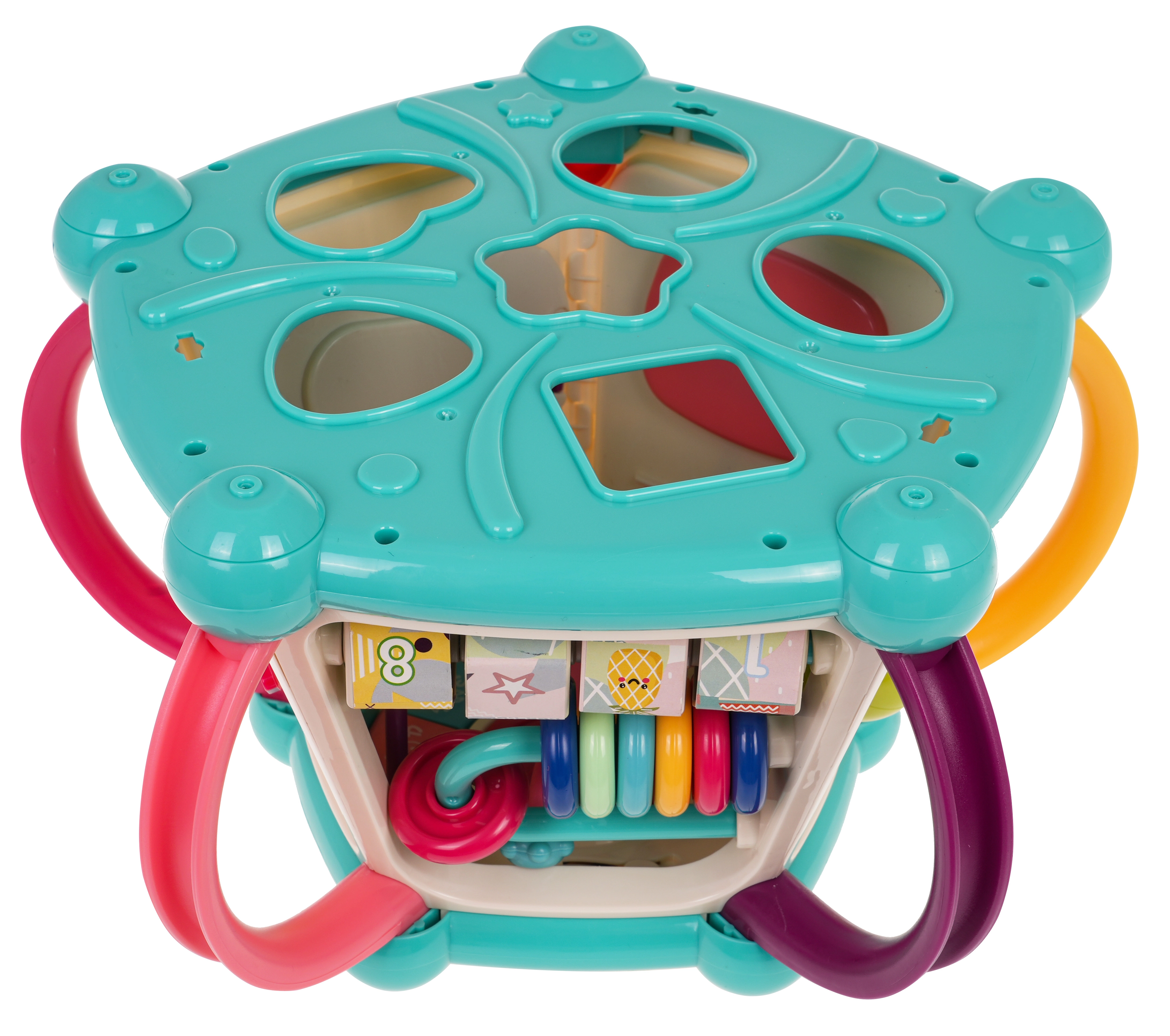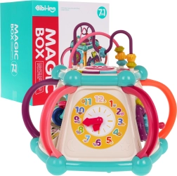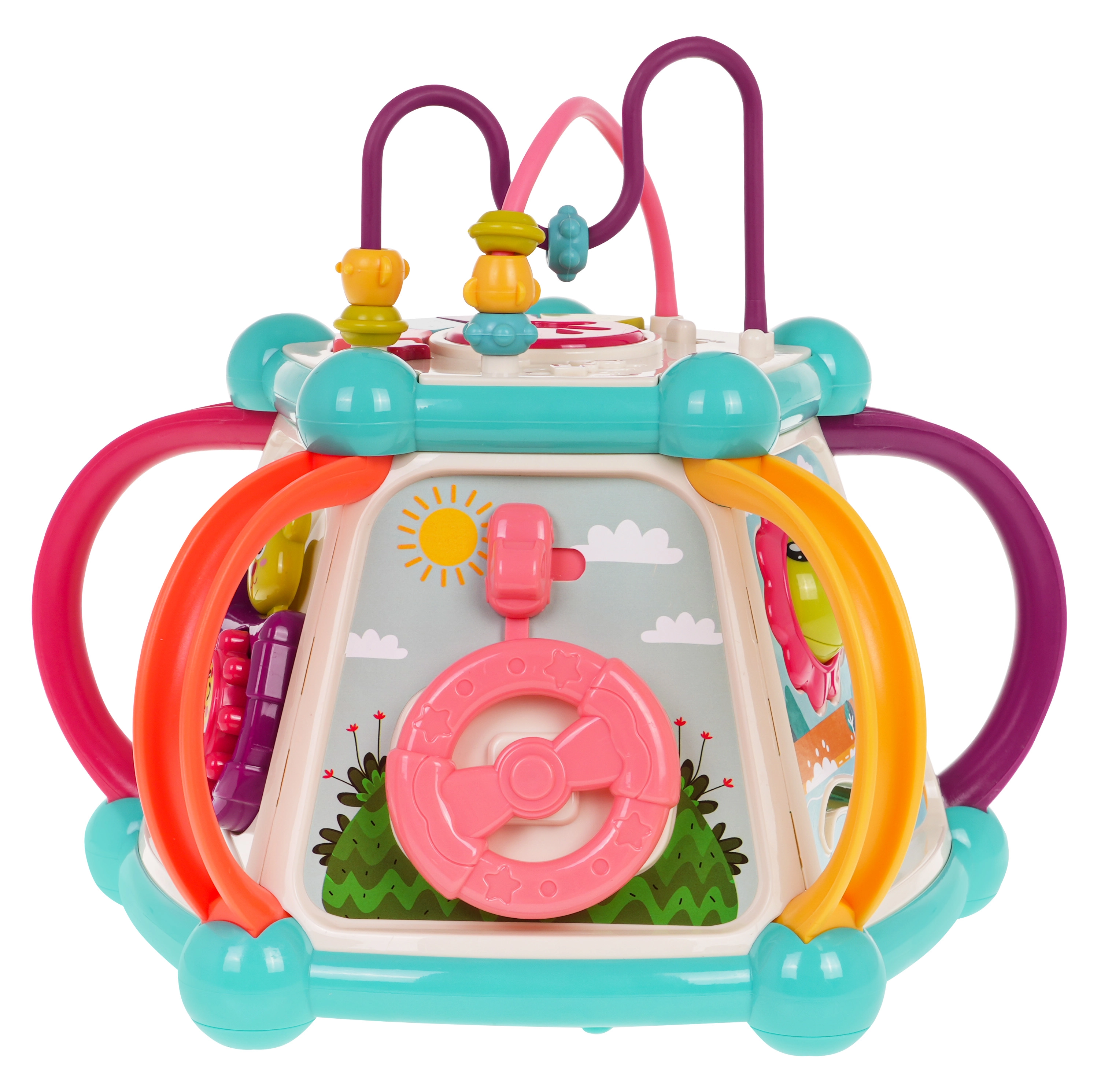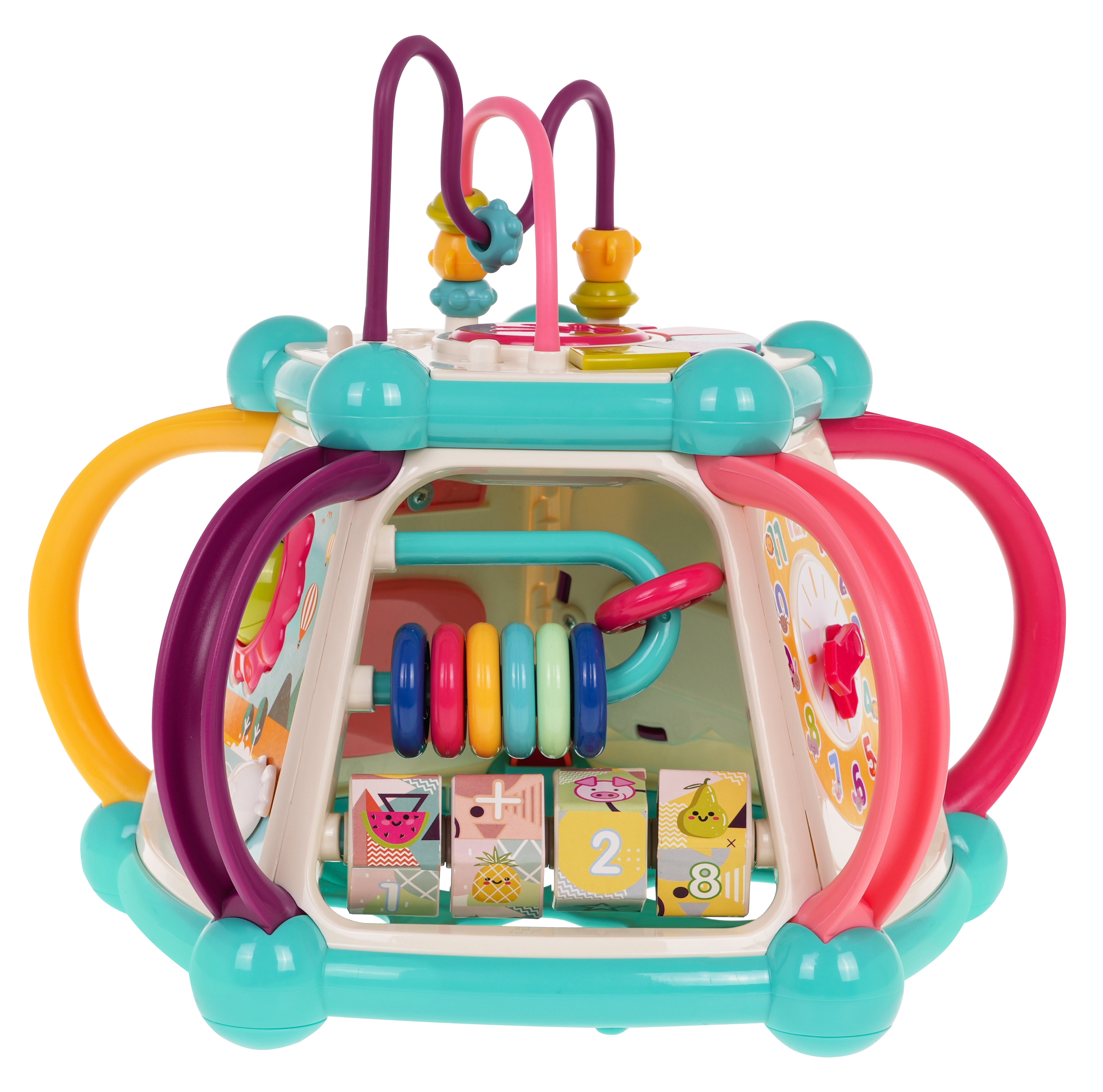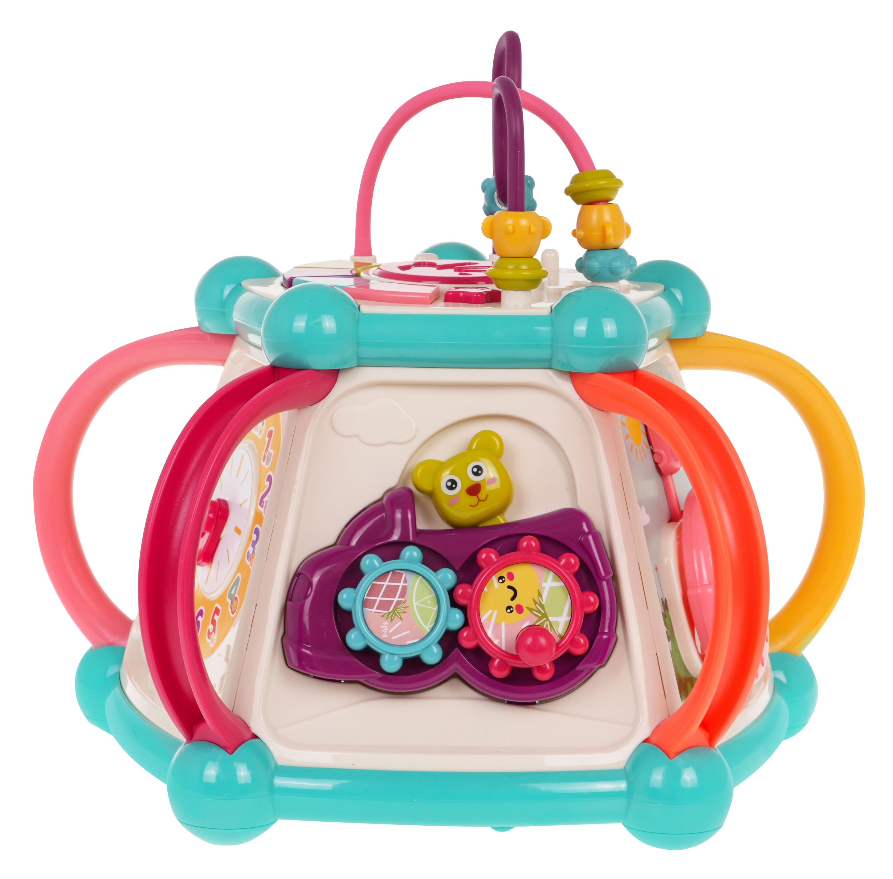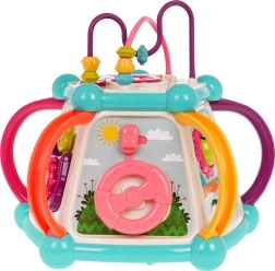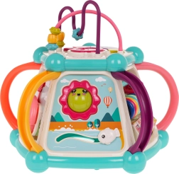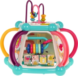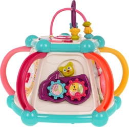 Šis spalvingas multifunkcinis kubas pagamintas iš kokybiško, saugaus plastiko ir puikiai tinka pirmiesiems pasaulio atradimams. Septynios žaidimų pusės siūlo įvairias veiklas: viršutinis skydelis su dėlione, dviejų lygių garsumo reguliavimu ir pianinu su šuniuko, kačiuko, avytes ir ančiuko garsais; šoninės pusės su skaitikliu, laikrodžiu su rodyklėmis, dantračiais ir meškiuku, vairu su mašinėle ir smagia žuvele su saule. Apatinėje dalyje yra rūšiavimo anga formoms ir 6 spalvotos kaladėlės.