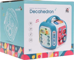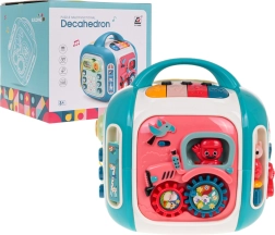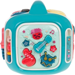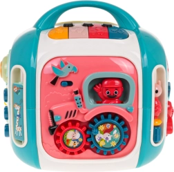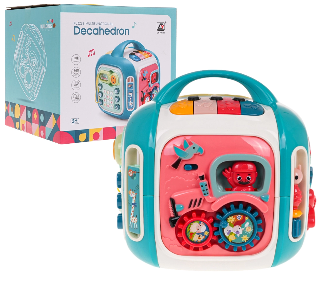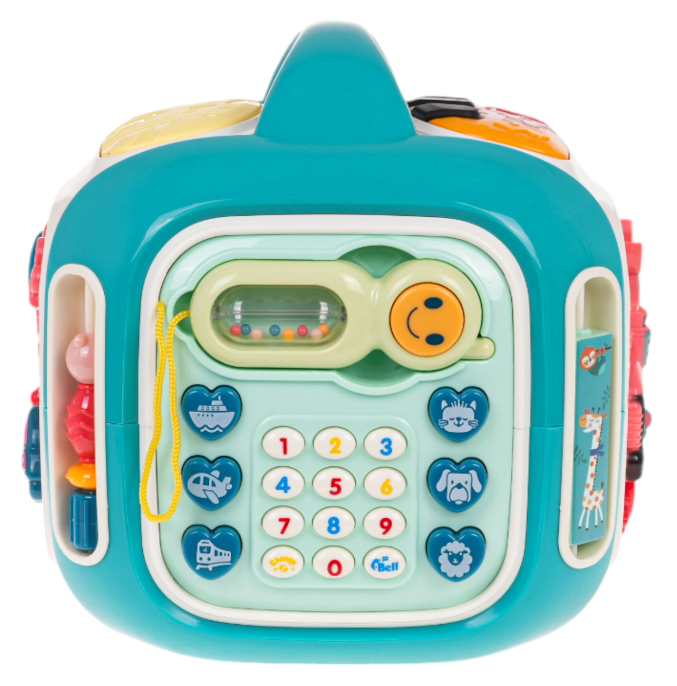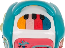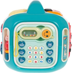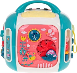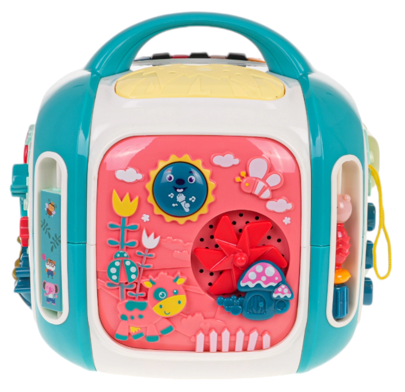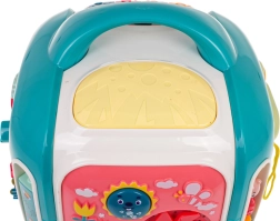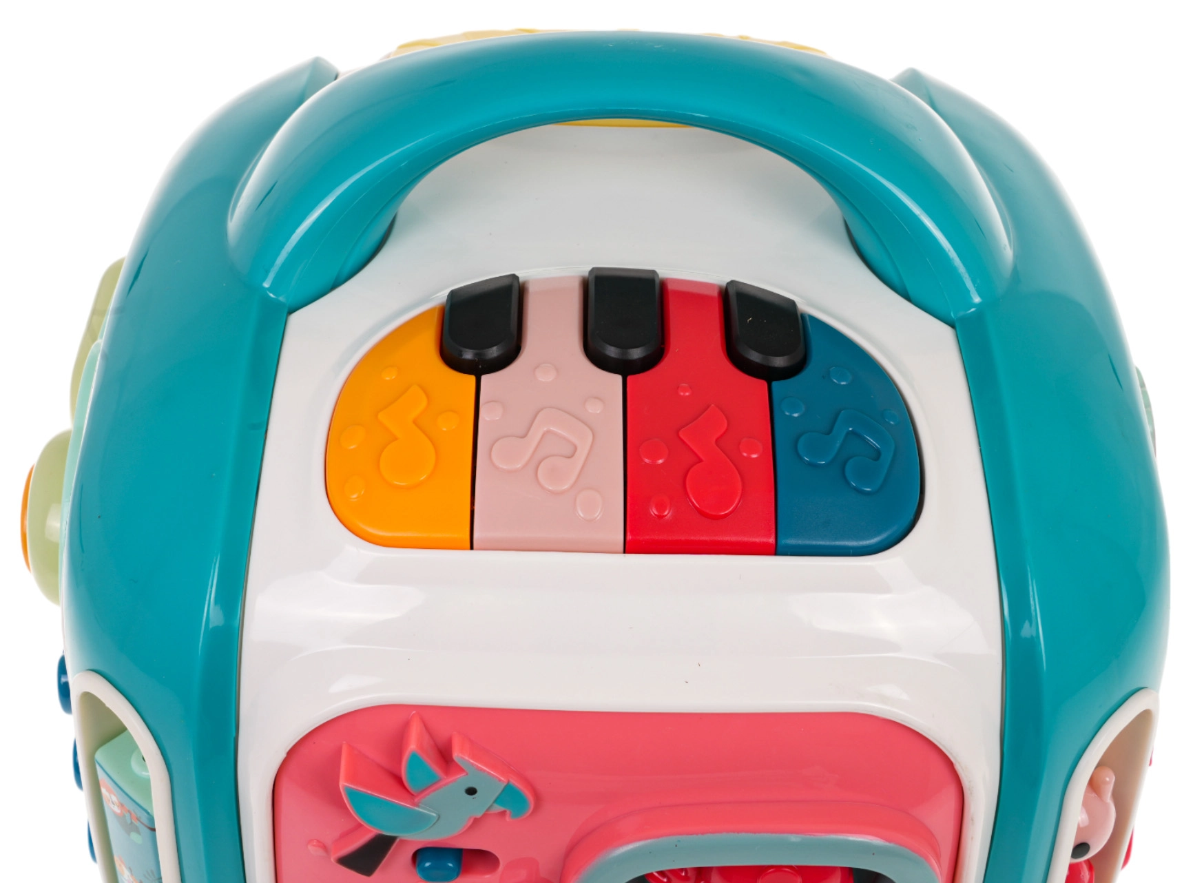 Interaktyvi kubo formos dėžutė sukurta pramogai ir mokymuisi. Vaikai pažįsta spalvas, formas, gyvūnų ir transporto priemonių pavadinimus, lavina pirštukus su sukamais elementais ir atranda įvairias melodijas bei garsus. Viršutinis pianino skydelis siūlo 3 režimus ir jautrius klavišus patogiam grojimui.