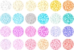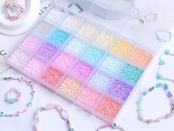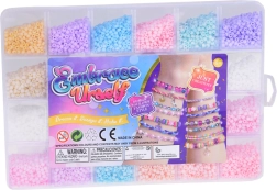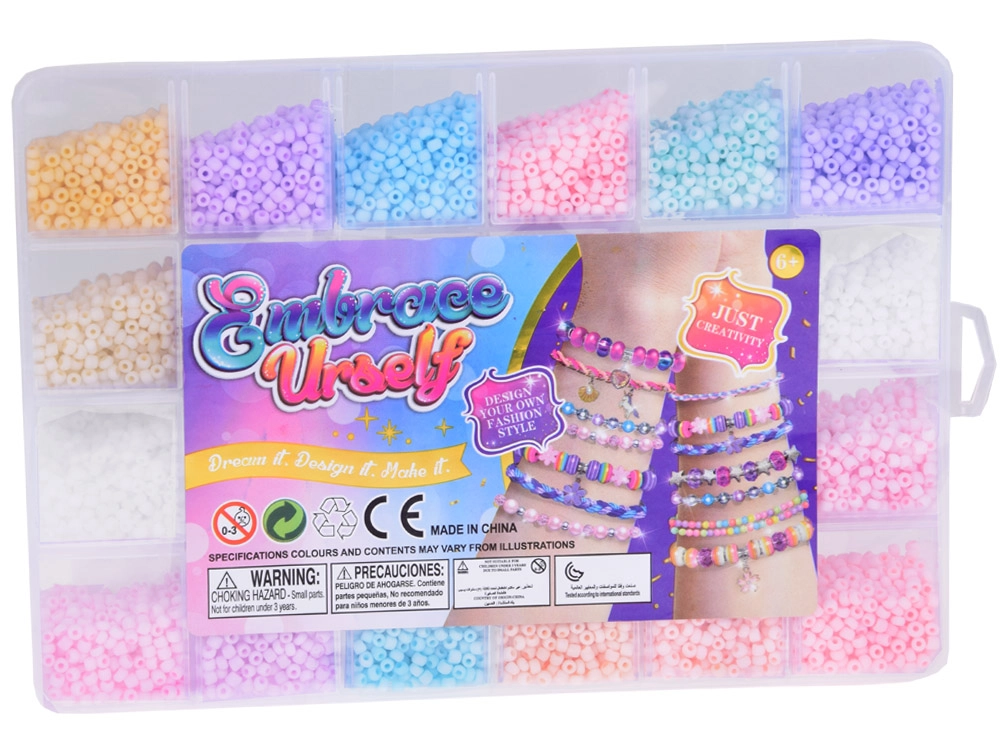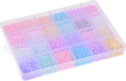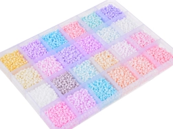 Rinkinyje yra 24 skirtingos pastelinių spalvų karoliukų: rožiniai, violetiniai, mėlyni, rusvi, žali, balti ir geltoni. Jie sudėti į permatomą, pailgą dėklą, kuris patogiai suskirstytas į skyrelius. Taip išvengiama karoliukų susimaišymo ir palengvinamas jų rūšiavimas.