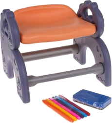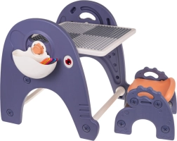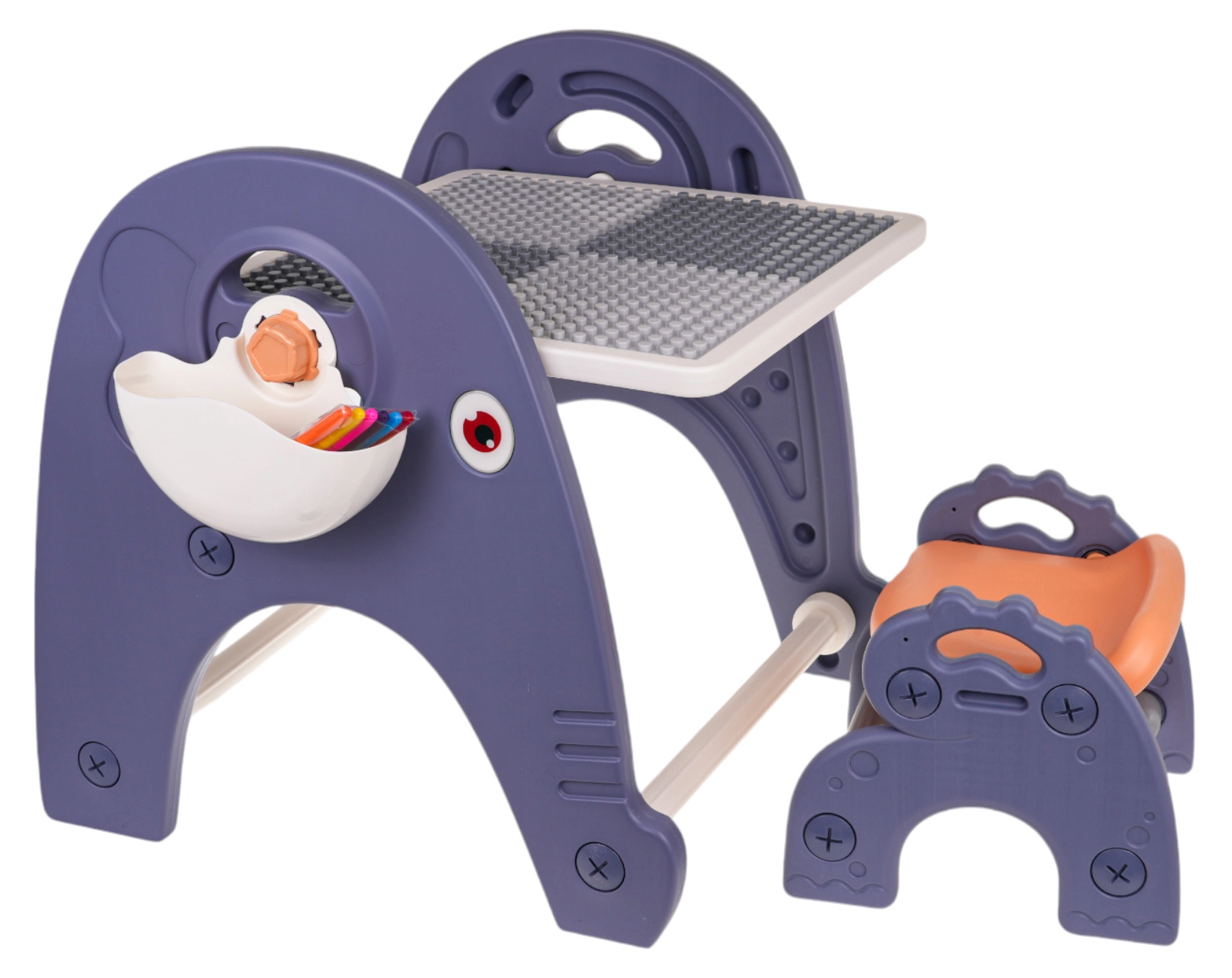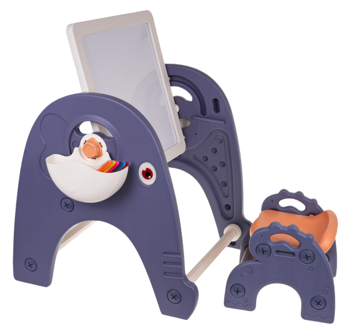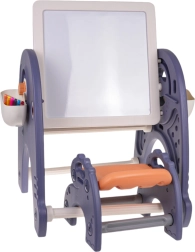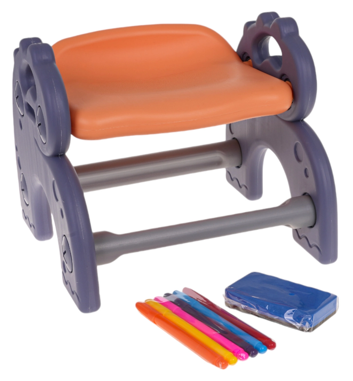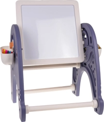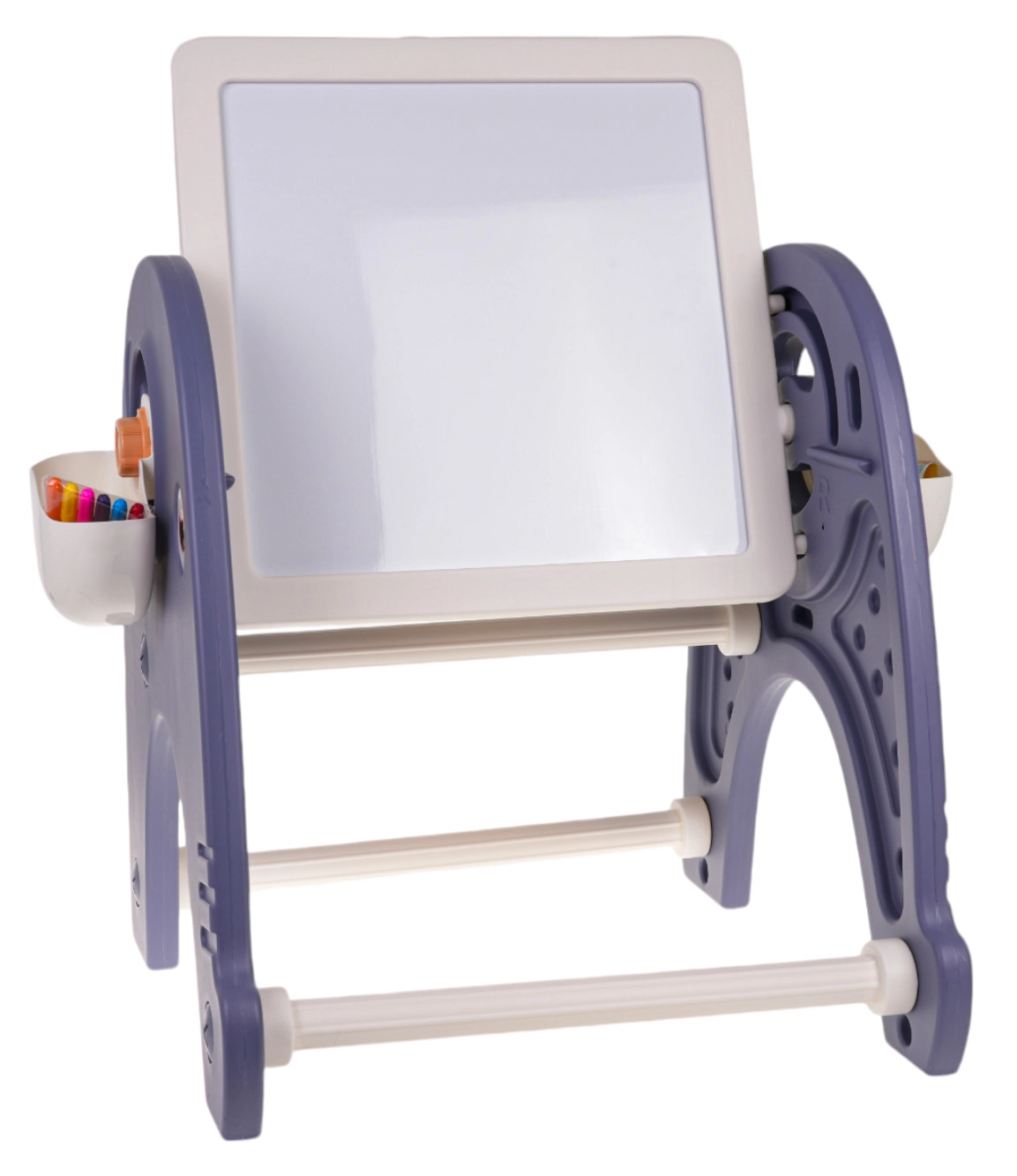 Universalus rinkinys mažiesiems kūrėjams: lenta, stalas, konstruktorių pagrindas ir kėdutė 4 viename vaikams nuo 3 metų. Tvirta kokybiško plastiko konstrukcija, be aštrių briaunų, su galimybe lankstyti ir sukti lentą. Iš vienos pusės balta piešimo lenta, iš kitos – tekstūruotas pagrindas kaladėlėms. Rinkinyje yra 6 spalvoti flomasteriai, kempinėlė ir šoniniai krepšeliai reikmenims – idealiai tinka piešti, mokytis ir žaisti.