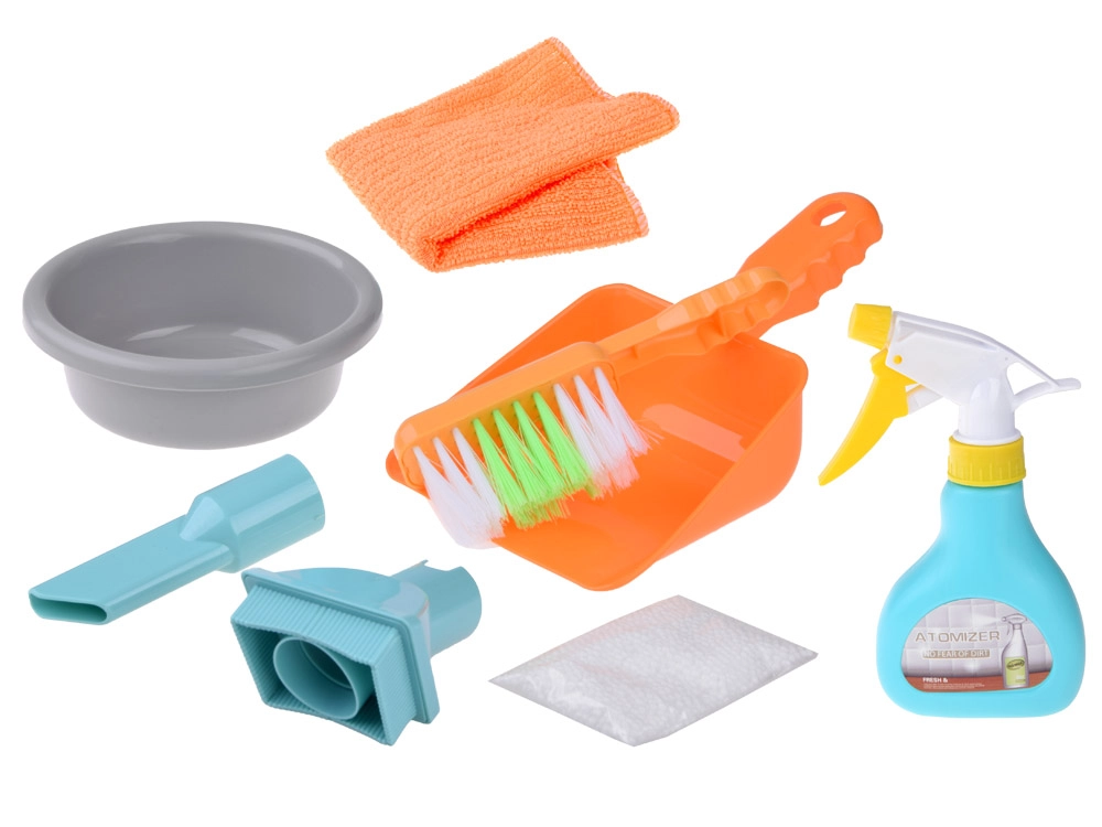 Šluotelė, semtuvėlis, purkštuvas, skudurėlis, dubenėlis ir maišelis su rutuliukais – viskas, ko mažajam pagalbininkui reikia įvairiam valymo žaidimui.