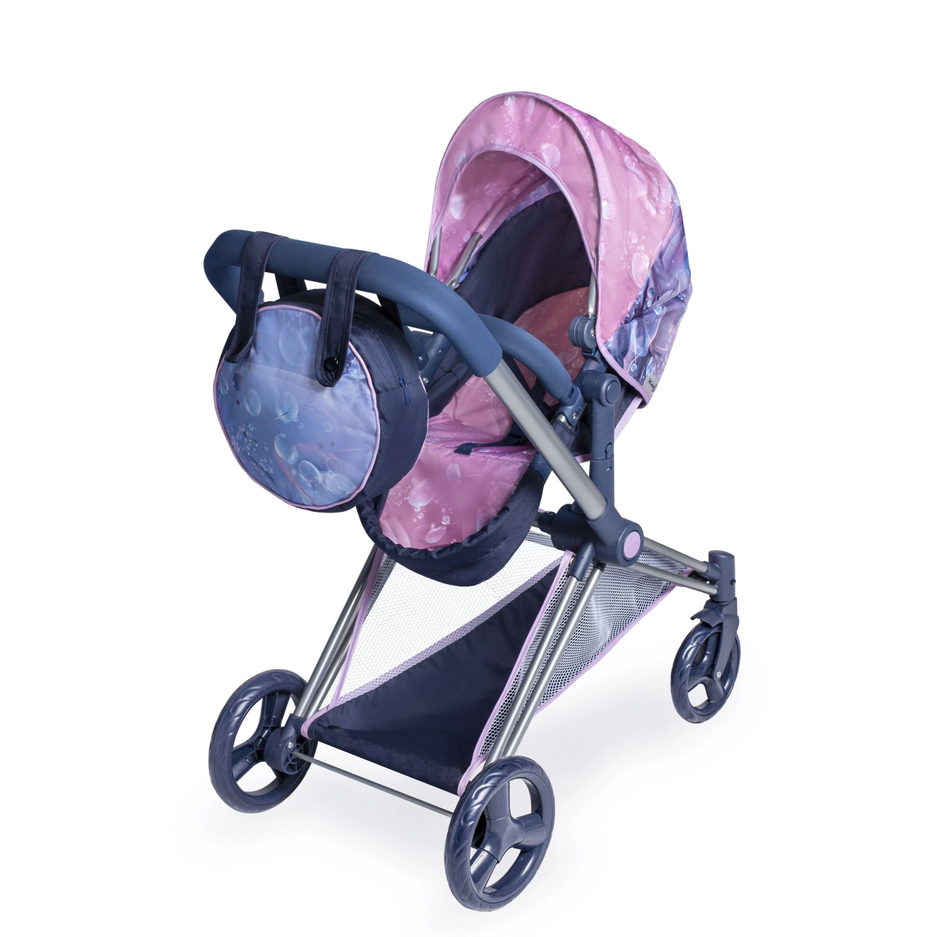 Vežimėlis siūlo apgalvotas detales patogiam žaidimui: trijų taškų diržų sistema saugiam lėlės prisegimui, reguliuojamas stogelis nuo saulės, lopšio uždangalas su lipdukais greitam uždėjimui ir erdvus apatinis krepšelis smulkmenoms. Komplekte taip pat yra stilingas apvalus krepšys kolekcijos spalvomis, derantis su žaismingu burbulų motyvu.