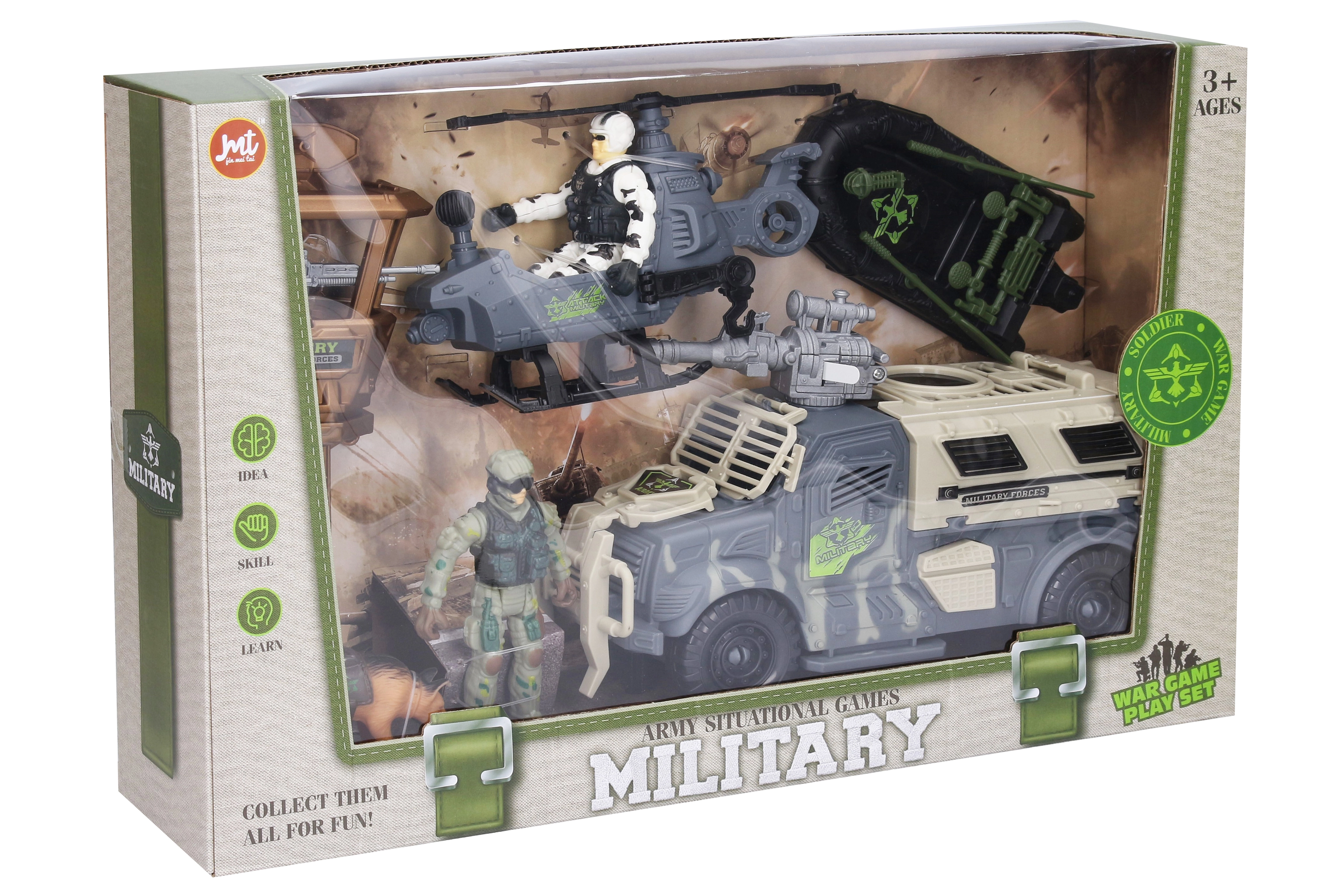 - Pilna komplektacija: transporto priemonė, sraigtasparnis, valtis, bokštas, ginklai, šuo ir 2 kareivių figūrėlės