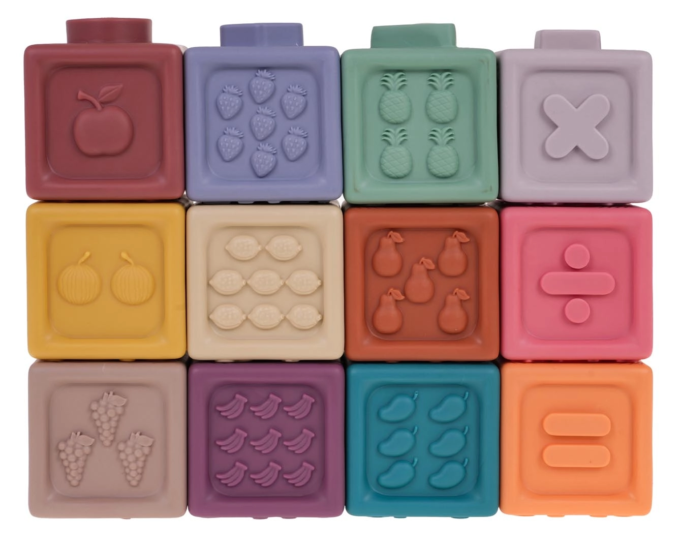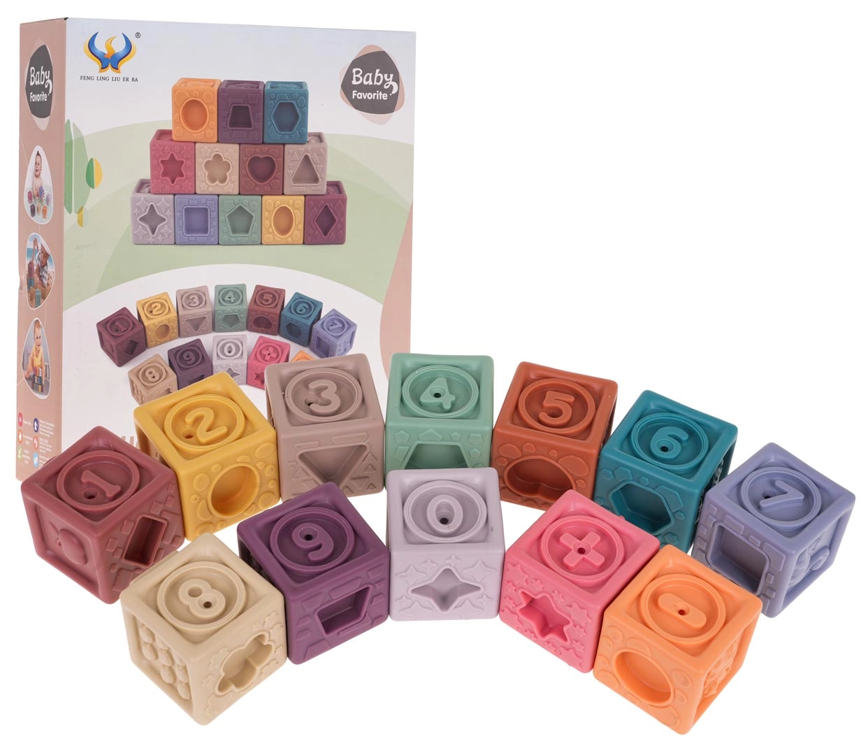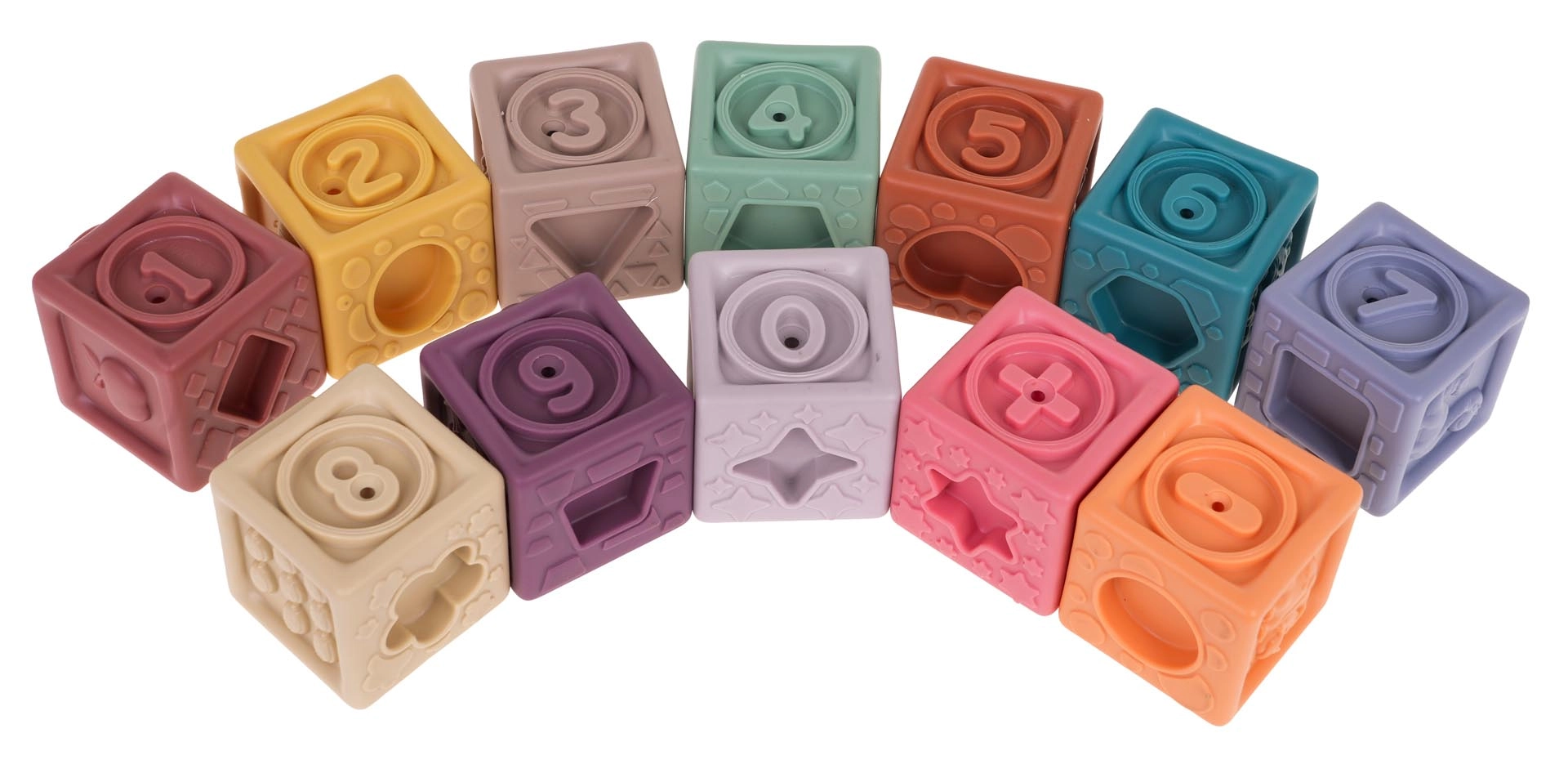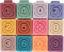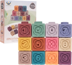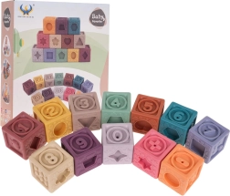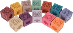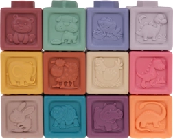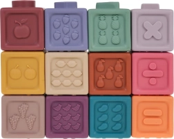Rinkinyje yra 12 įvairiaspalvių silikoninių kaladėlių, kurios skatina vizualinę stimulaciją ir vaikų kūrybiškumą.