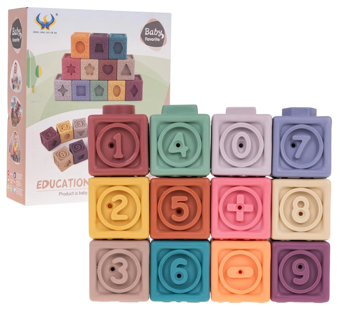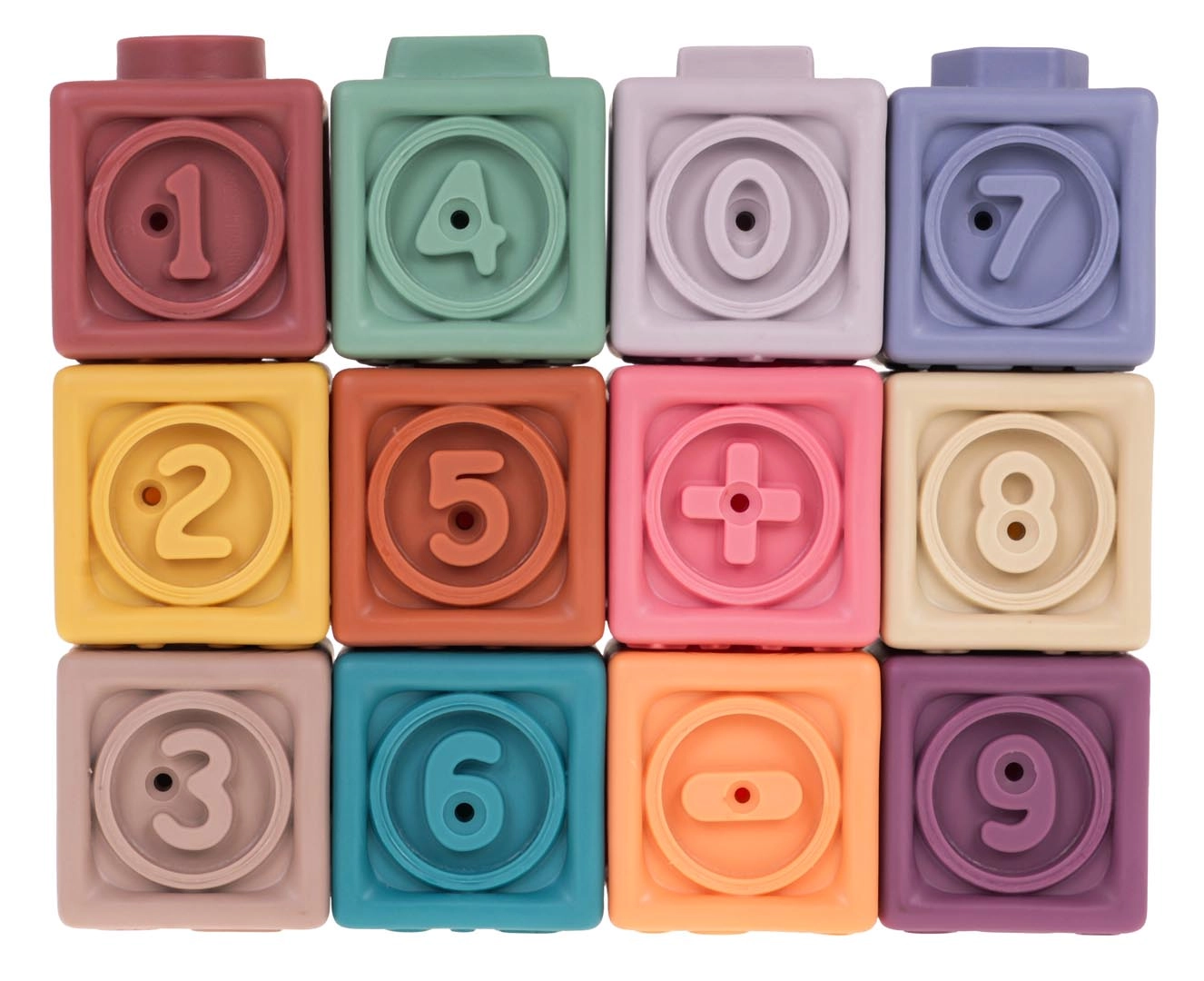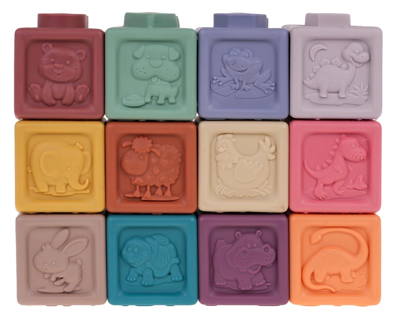 Rinkinyje yra 12 įvairiaspalvių silikoninių kaladėlių, kurios skatina vizualinę stimulaciją ir vaikų kūrybiškumą.