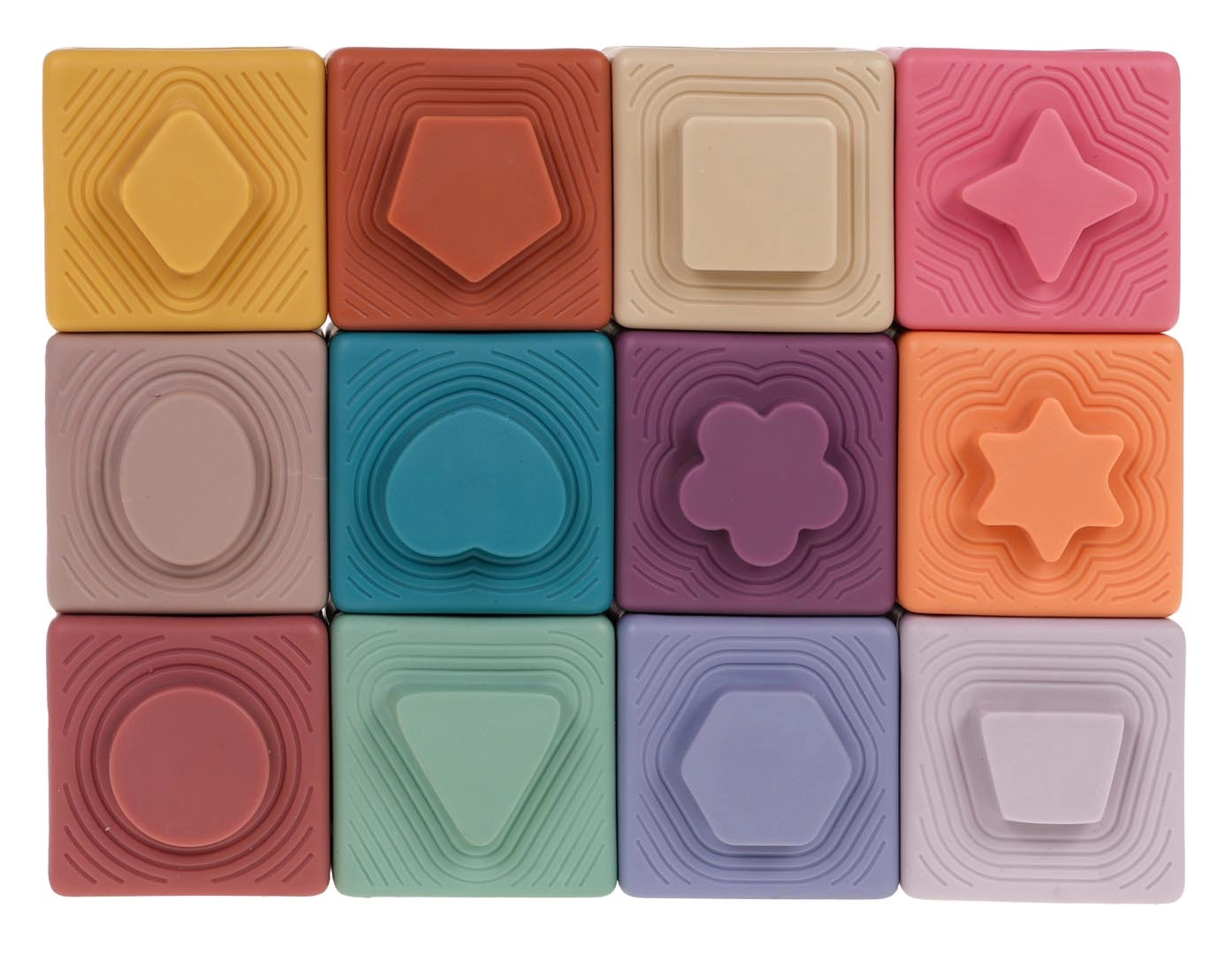 - 12 kaladėlių su skirtingomis tekstūromis ir spalvomis