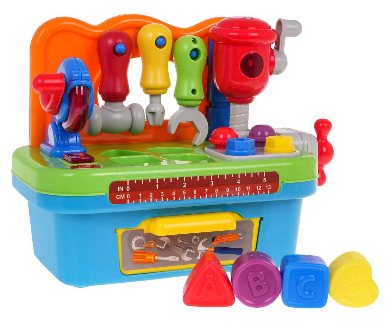 Po stalviršiu yra atidaromas stalčiukas, į kurį vaikai gali susidėti įrankius ir kaladėles, formuotas pagal įvairias raides ir formas. Dirbtuvės maitinamos trimis AG13 tipo baterijomis, kurios yra rinkinyje.