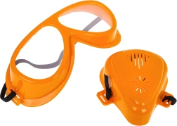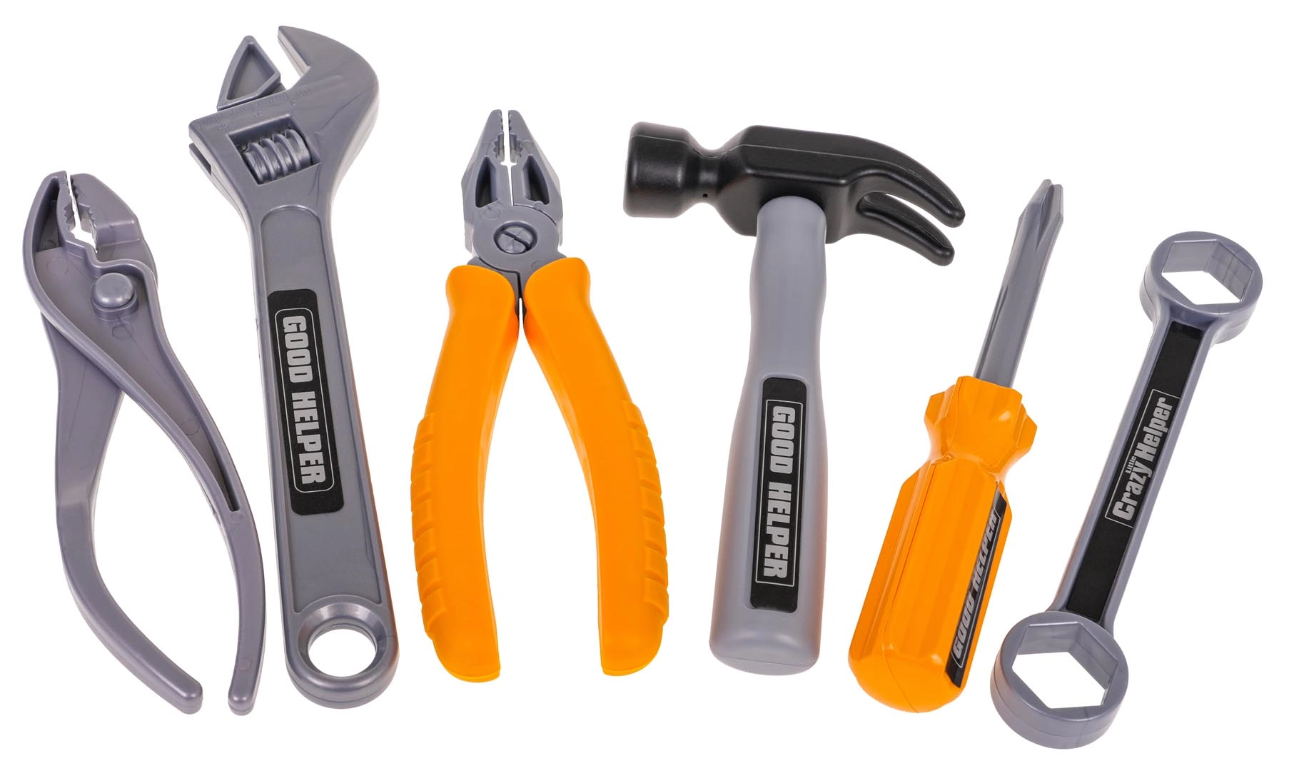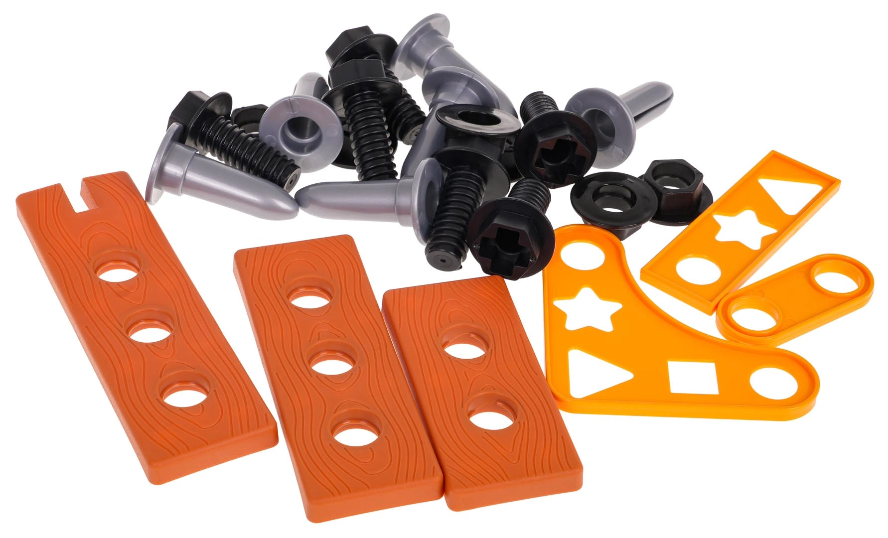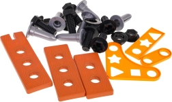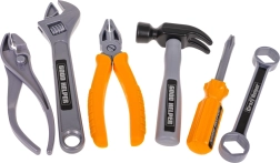 Atsuktuvas, plaktukas, raktai, replės, apsauginiai akiniai ir kaukė, medinės juostelės ir tvirtinimo detalės. Viskas kūrybiškai statybai ir smulkiajai motorikai lavinti.