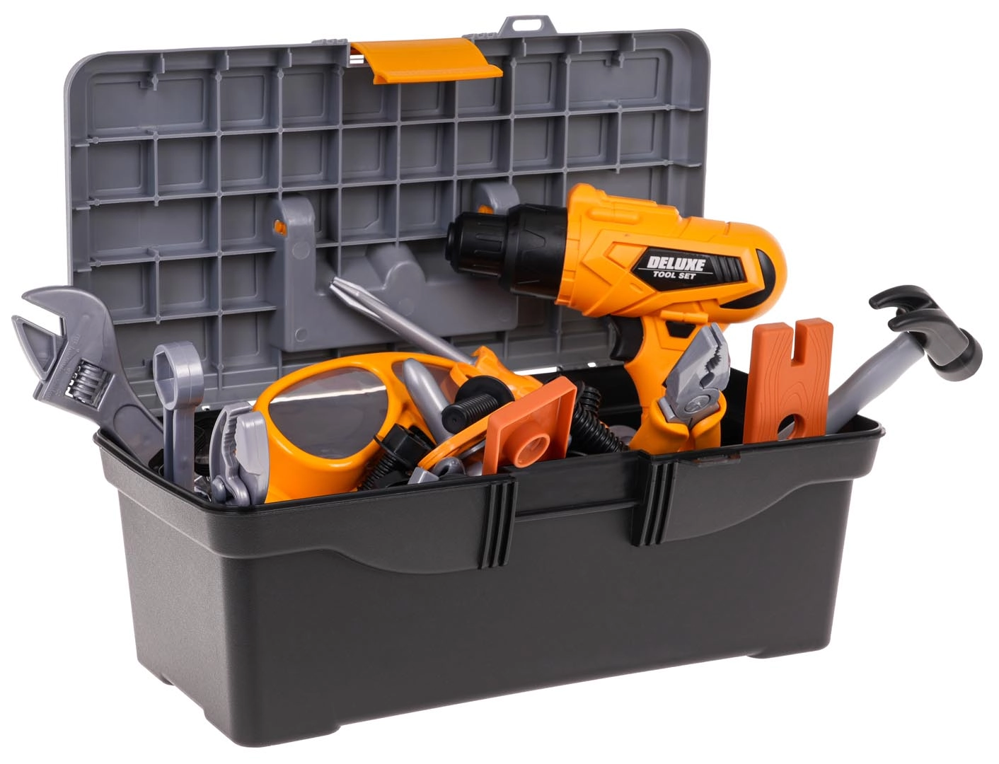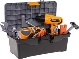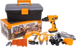 Šis vaikiškas įrankių rinkinys siūlo viską, ko reikia mažajam meistrui: didelę įrankinę, apsauginius akinius ir kaukę, plaktuką, atsuktuvą, replės, raktus bei statybines detales su varžtais ir kaiščiais. Dėl kokybiško plastiko rinkinys lengvas, patvarus ir puikiai tinka profesionalų vaidmenų žaidimams.