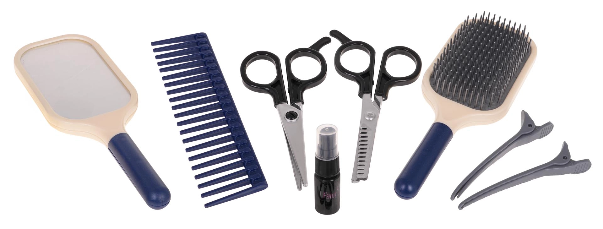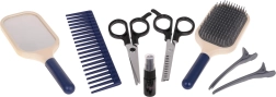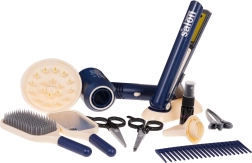 Rinkinyje vaikai ras viską, ko reikia mažajam kirpėjui: žirkles, filiravimo žirkles, šukas, šepetį, veidrodėlį, segtukus, kosmetikos indelį ir stovelį džiovintuvui arba tiesintuvui. Kokybiškas apdirbimas ir saugios medžiagos užtikrina patogų ir saugų naudojimą.