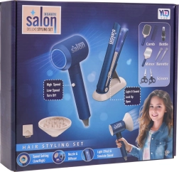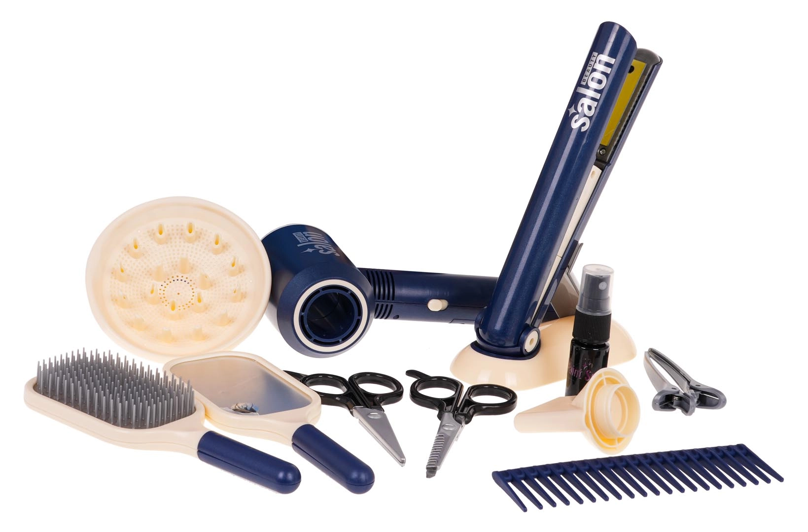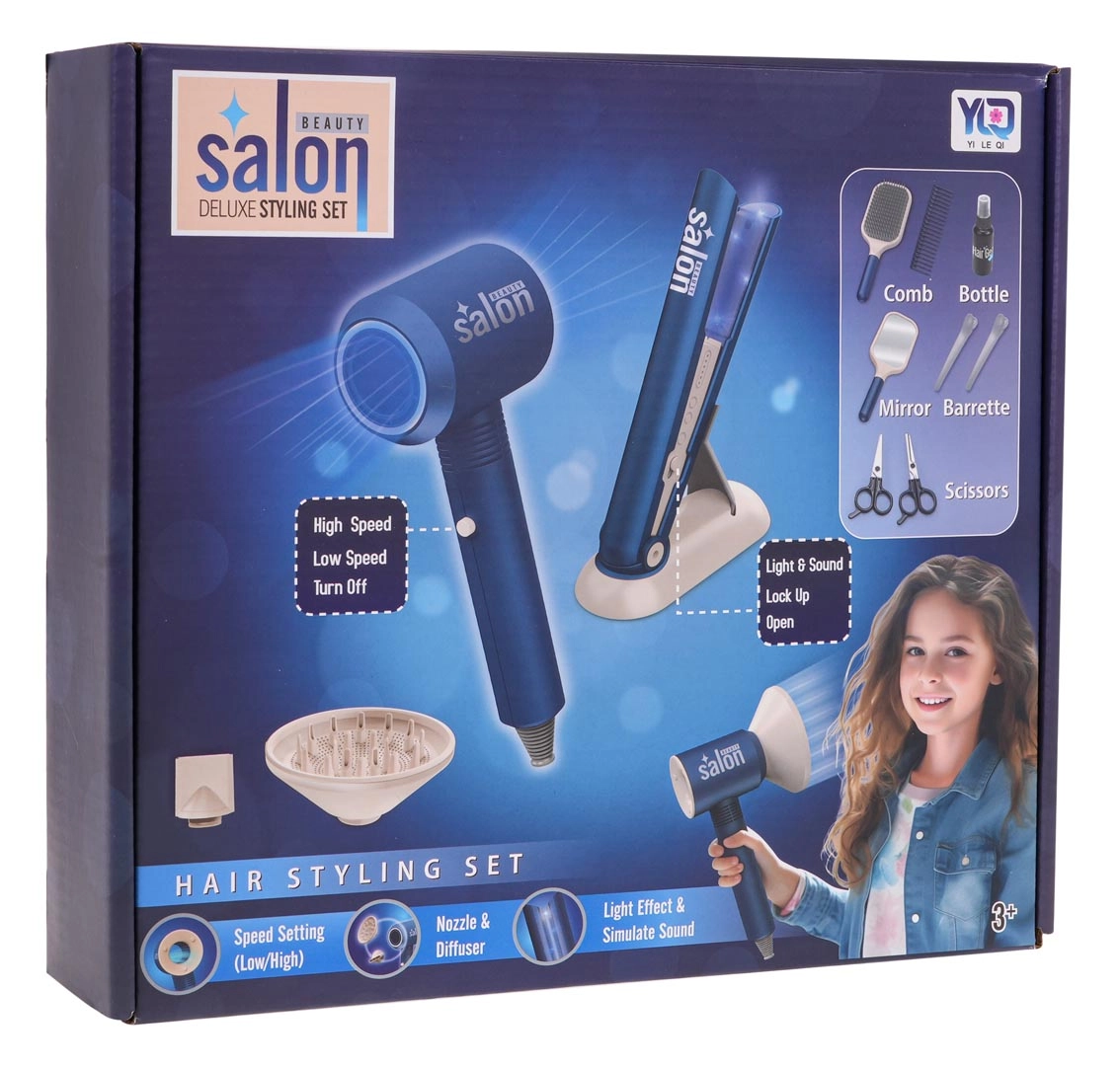 Šis gausiai aprūpintas mėlynos spalvos kirpimo rinkinys suteiks vaikams valandų valandas pramogų ir fantazijos. Pagrindinė žvaigždė – baterijomis maitinamas džiovintuvas su keičiamais antgaliais, kuris iš tikrųjų pučia ir skamba kaip tikras. Plaukų tiesintuvas šviečia ir leidžia realistiškus garsus, todėl grožio salono žaidimas atrodo autentiškas.