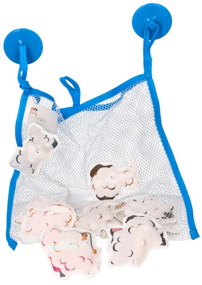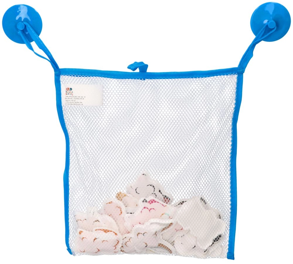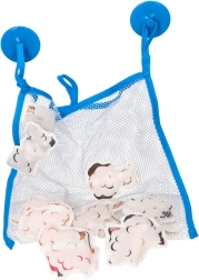 Rinkinį papildo erdvus tinklelis (23 × 27 cm) su dviem siurbtukais, skirtais tvirtinti prie lygaus paviršiaus. Tinklelis palengvina žaislų tvarkymą, greitą vandens nubėgimą ir higienišką džiovinimą, todėl vonios kambarys išlieka tvarkingas.