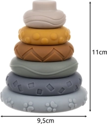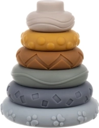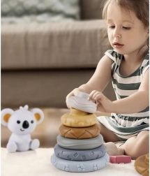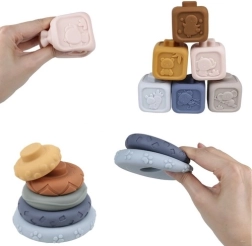 Rinkinyje yra įvairių žiedų ir kubelių statymui bei dėliojimui, kas skatina vaikų kūrybišką ir loginį mąstymą.