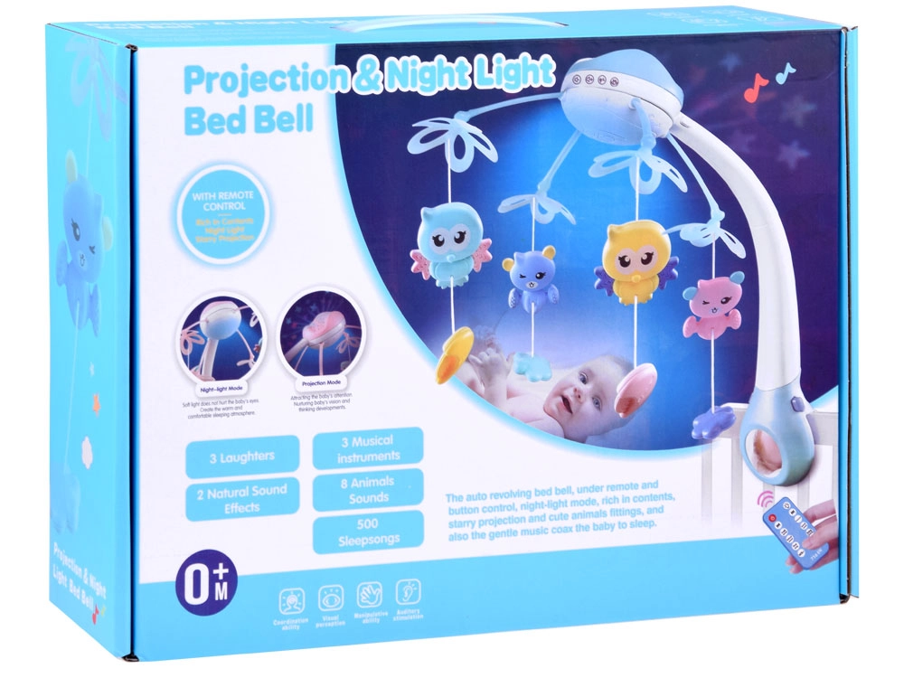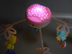 Vaikiškas karuselė virš lovytės su projektoriumi ir nuotoliniu valdymu