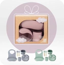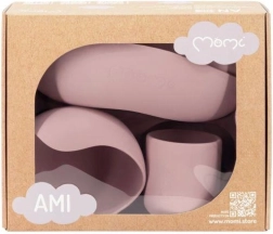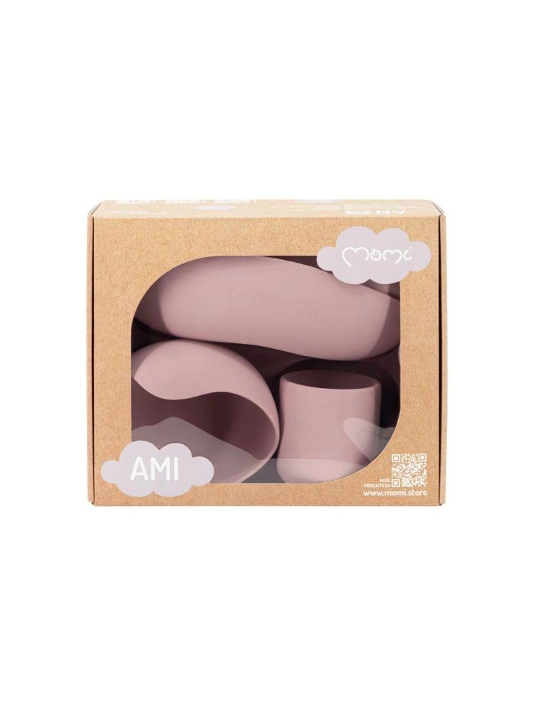 Rinkinys MoMi Ami sukurtas patogiam ir saugiam pirmajam maitinimui. Paaukštinti kraštai ir trijų dalių lėkštė palengvina maisto semimą ir porcijų atskyrimą, o stiprūs siurbtukai ant dubens ir lėkštės tvirtai laiko indus ant stalo ar maitinimo kėdutės padėklo. Puodelis 180 ml ir dubuo 360 ml yra idealios talpos kasdieniam naudojimui.
