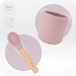 Stalo reikmenys pagaminti iš minkšto, su maistu saugaus silikono ir yra be BPA ir ftalatų. Silikonines dalis galima plauti indaplovėje ir naudoti mikrobangų krosnelėje. Stalo įrankių medinės rankenėlės ergonomiškos ir maloniai gula į vaiko ranką. Į komplektą įeina ir patogus seilinukas su gilia kišene, kuris sulaiko trupinius ir lašus.