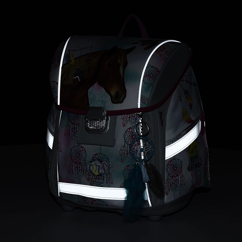 Mokyklinis rinkinys OXYBAG Premium Light – arklys Romantic derina itin lengvą, bet kartu stabilią kuprinę su sumania komplektacija patogiam kasdieniam nešiojimui. Dėl kvėpuojančio paminkštinimo, plačių paminkštintų petnešų ir krūtinio dirželio ji tvirtai laikosi ant nugaros ir tolygiai paskirsto apkrovą. Patrauklus arklio motyvas su švelniomis spalvomis ir sapnų gaudykle pradžiugins visus arklių mylėtojus.