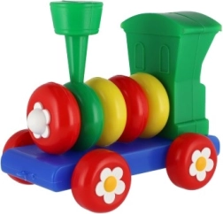 Traukinukas pagamintas iš plastiko ryškių spalvų, kurios traukia vaikų dėmesį, o ratai papuošti gėlių motyvais.